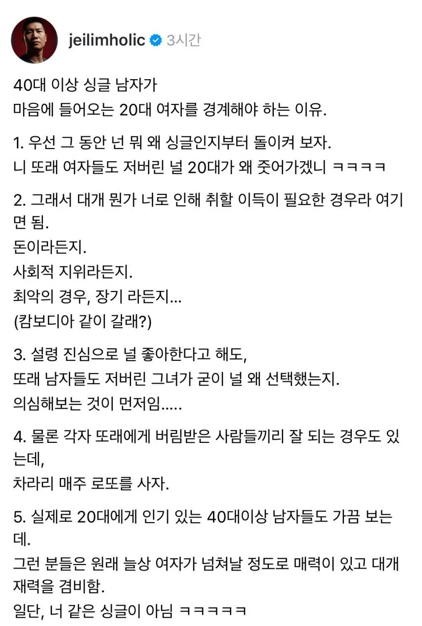 현재 상황으로 옮겨 보면 20대가 왜 40대 남성에게 관심을 보일지에는 다양한 이유가 있다. 누군가는 안정감을 원하고, 누군가는 그들의 경험을 배우고 싶어 하는 호기심일 수도 있다. 하지만 언제나 상대의 의도와 관계의 속도를 확인하는 일이 중요하다. 경계는 서로를 지켜 주는 최소한의 기준으로 작동하니까 말이다.