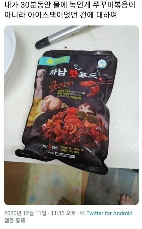 제목은 '30분동안 녹인 냉동 쭈꾸미 볶음의 정체.jpg'라더니, 사진 속에는 물기 젖은 아이스팩 위에 낙지처럼 보이는 조각이 포개져 있었다.