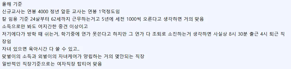 신규교사의 연봉은 대략 4,000만 원대쯤이라고 들려오고, 정년을 앞둔 교사의 연봉은 1억에 달할 수도 있다네요. 시작 시기가 24살 정도이고 5년마다 약 1000만 원 정도 세전으로 오르는 구조를 감안하면, 경력과 직무에 따라 숫자는 크게 달라진다고 해요. 방학의 3개월도 쉬는 게 아니라, 학기 중에 연가를 거의 쓰지 못하거나 조퇴로 소진하는 현실이 겹쳐 있습니다. 자녀가 있으면 육아 시간도 늘어나 맞벌이의 소득과 외벌이의 자녀 케어가 맞아떨어지는 경우가 드물지 않죠.