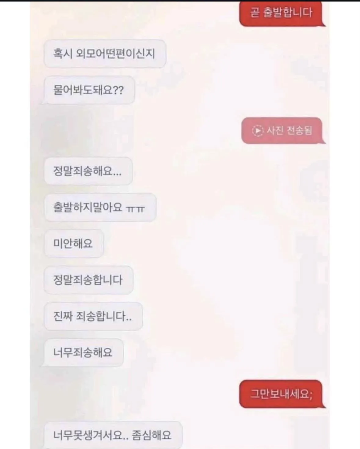 배경은 이렇다. 상대는 외모 이야기를 먼저 꺼내며, 프로필의 조명과 각도를 하나하나 분석하는 취미가 있는 것처럼 보인다. 추가 사진을 달라고 몇 번이고 손을 올리며, 답장마다 작은 사과의 멘트가 섞여 온다. '미안해요...'라는 말이 연거푸 따라오고, 대화는 결국 셀카의 노출보정에 눌려 버린다. 이건 온라인 데이트의 흔한 풍경이기도 하다.
