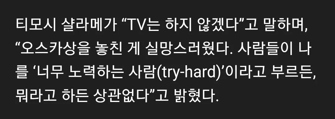 티모시 샬라메, 오스카상 이야기가 또 한바퀴 돈다. 이번엔 TV 출연은 하지 않겠다고 선언한 뒤, 수상에 대한 집착이 마치 벽에 걸린 명함처럼 벼려진다는 글들이 올라왔다. 이 흐름은 그를 단순히 '영화계의 신예'가 아니라 상에 삶이 걸려 있는 X세대 배우로 보이게 만든다. 과연 이 흐름이 어떤 배경에서 나온 건지, 우리도 모르게 호기심을 자극한다.
