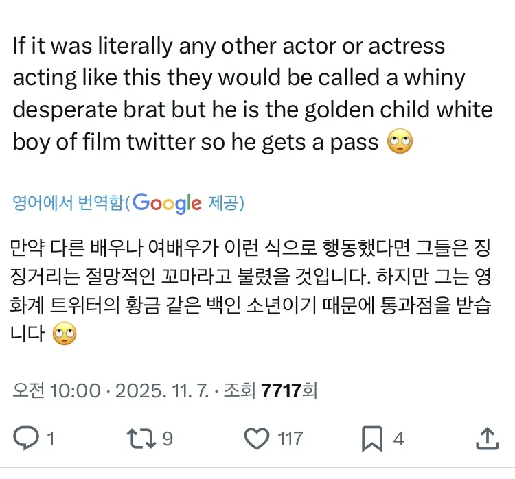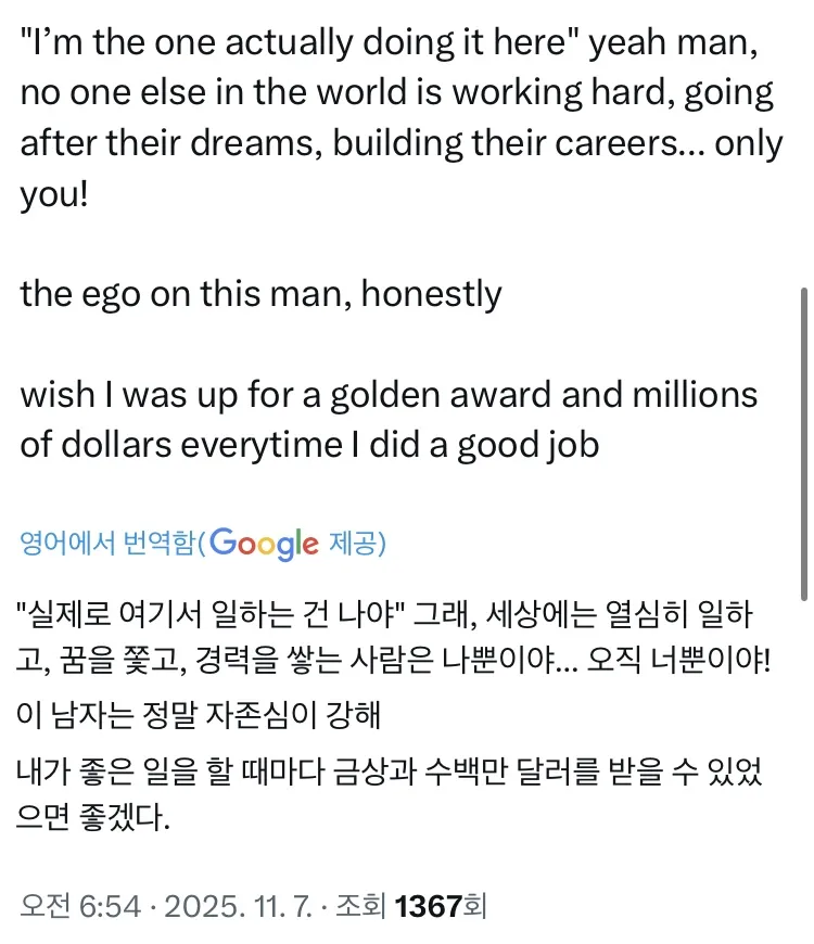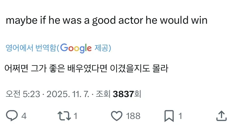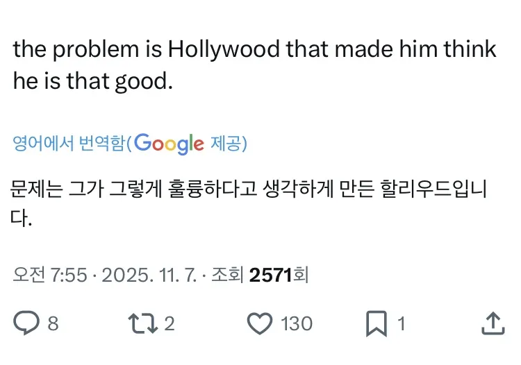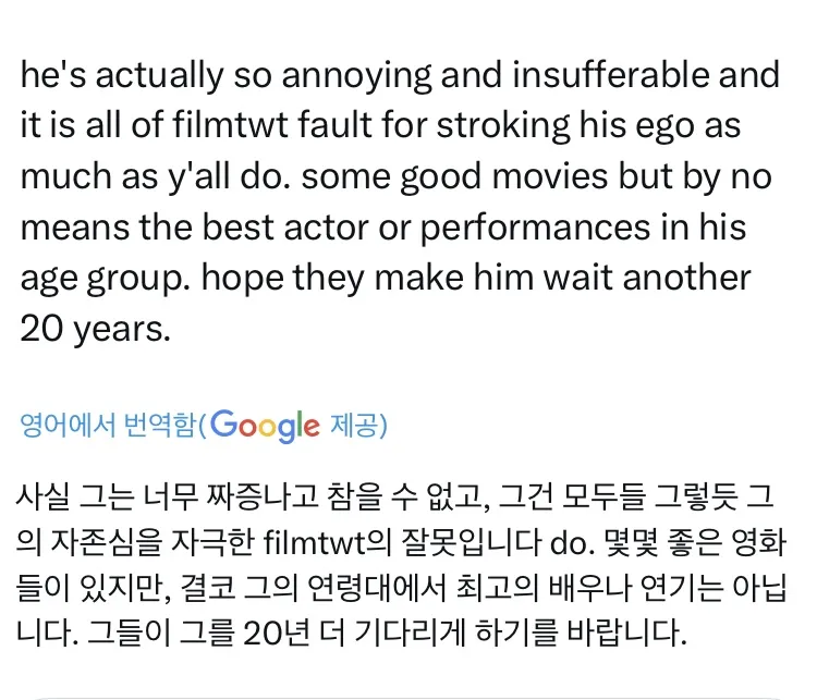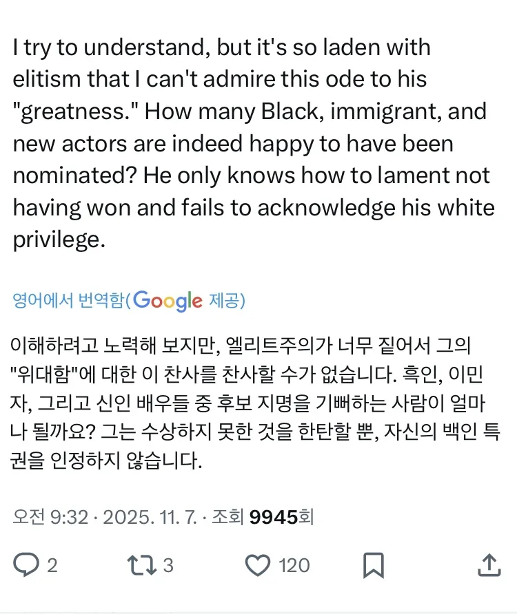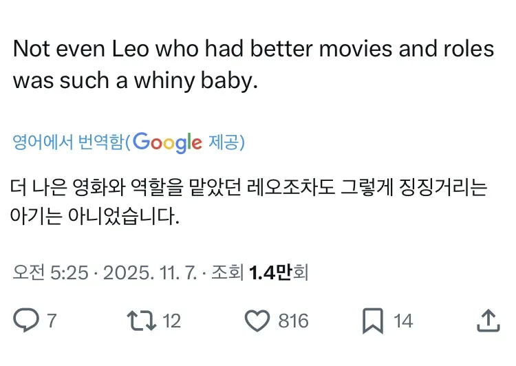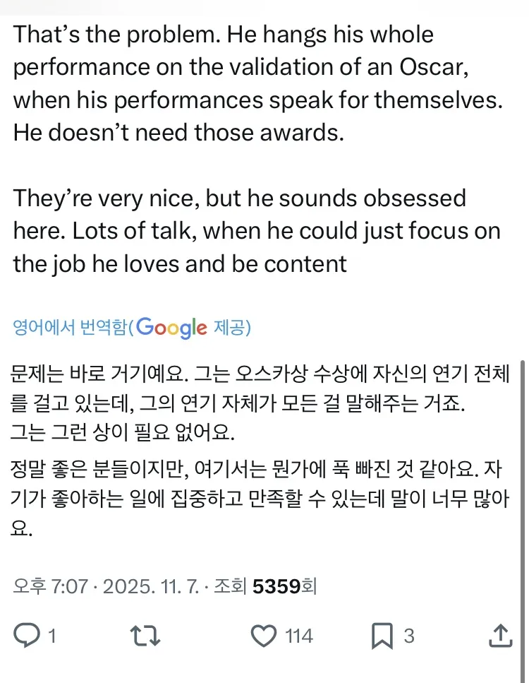 진짜 꾸준히 오스카상 얘기 해서 대중들 흠? 상태였는데 이번에 아예 대놓고 실망했다면서 다른 배우들은 이럴 거라면서 인터뷰해서 왜 저래... 상태