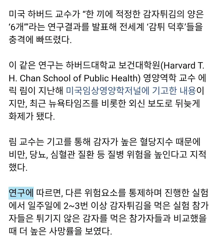 리서치의 핵심은, 일주일에 2~3번 감자튀김을 먹은 그룹이 비교군에 비해 더 높은 위험 신호를 보였다는 점으로 요약된다. 이 수치는 다른 위험요소를 통제한 뒤의 결과라서, 감자튀김 자체가 '원인'이라고 말하기엔 아직 무리가 있다. 연구를 이끈 에릭 림 교수의 주장은 감자의 혈당지수가 건강 문제를 키울 수 있다는 방향으로 연결된다.