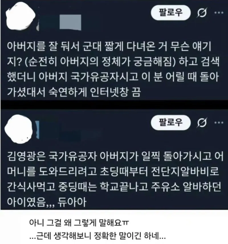 첫 단서는 늘 비슷하다. 아버지가 국가유공자였다는 소문이 퍼지자, 그 가족이 겪었을 일들이 자연스레 떠올랐고, 그래서 은광이 군복무를 '의미 있게' 짧게 마무리했다는 의혹이 생겨난다. 어릴 적 생활환경과 가족의 경제적 압박이 그의 결정에 그림자를 드리운 걸까? 기사 조각들이 흩어져 모이면, 그 그림은 늘 비극적이기보다 '극적 행간'으로 다가온다.