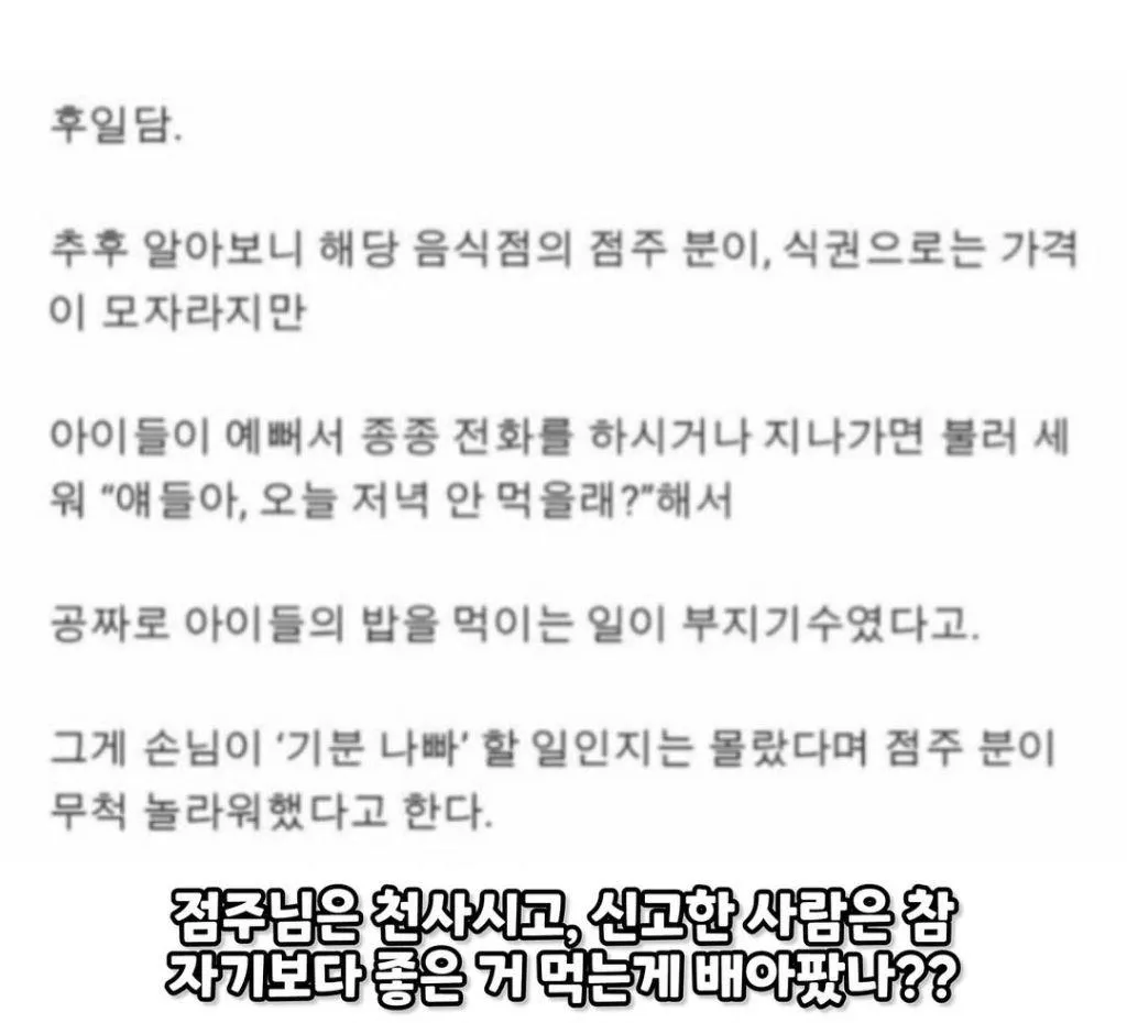 그 가게 주인은 소문으로만 듣던 ‘천사점주’일지도 모른다. 아이들이 예뻐 보이면 식권으로도 부족한 것은 채워주고, 지나가다 들려오는 '오늘 저녁 괜찮니?'라는 말에 불쑥 불려오는 아이들 식탁이 많다고 한다. 센터에 접수됐다는 소문도 있었지만, 실제로는 점주가 예의로 나눔을 이어가고 있다는 이야기가 돌아다닌다. 일반 손님들은 그저 '가격대가 다르다' 정도로 생각했지만, 점주가 남긴 작은 친절의 파문은 생각보다 커 보인다.