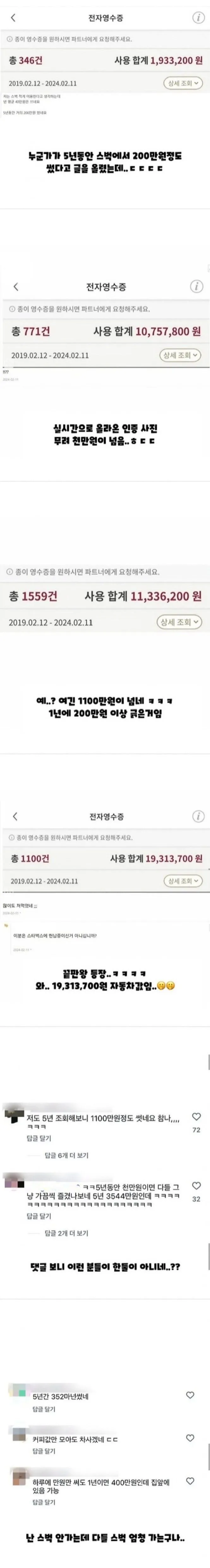 스타벅스에서 5년간 결제한 금액 인증한 사람들ㄷㄷㄷ