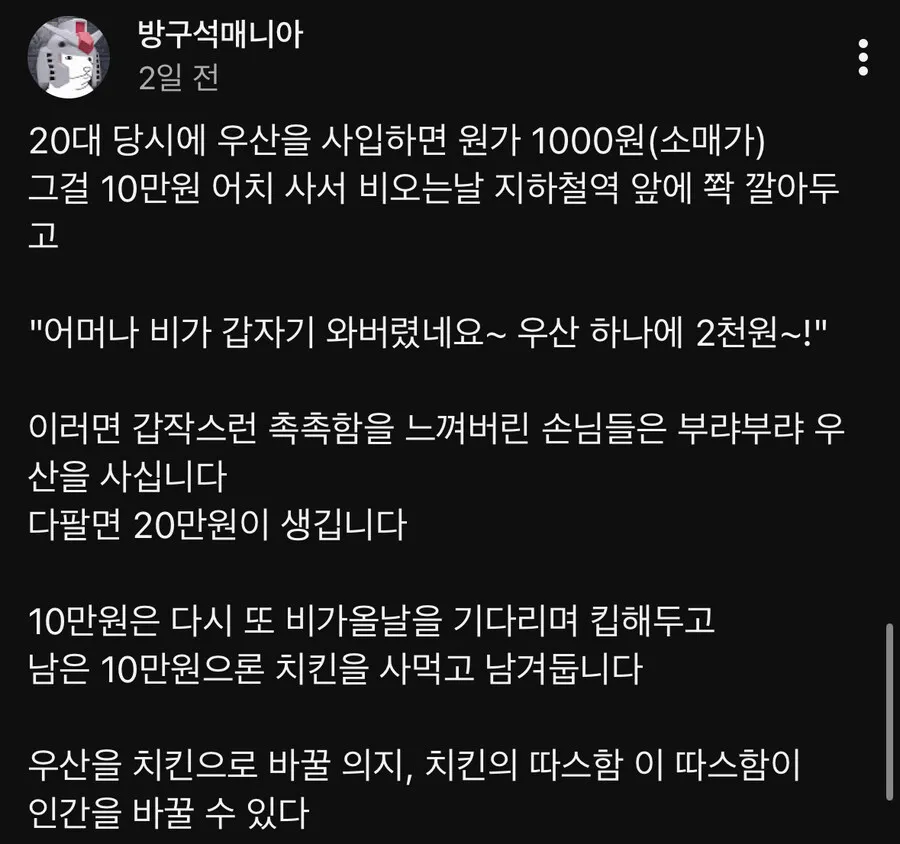 지하철 역 앞에서 판 돈으로 치킨을 뜯어먹었다는
