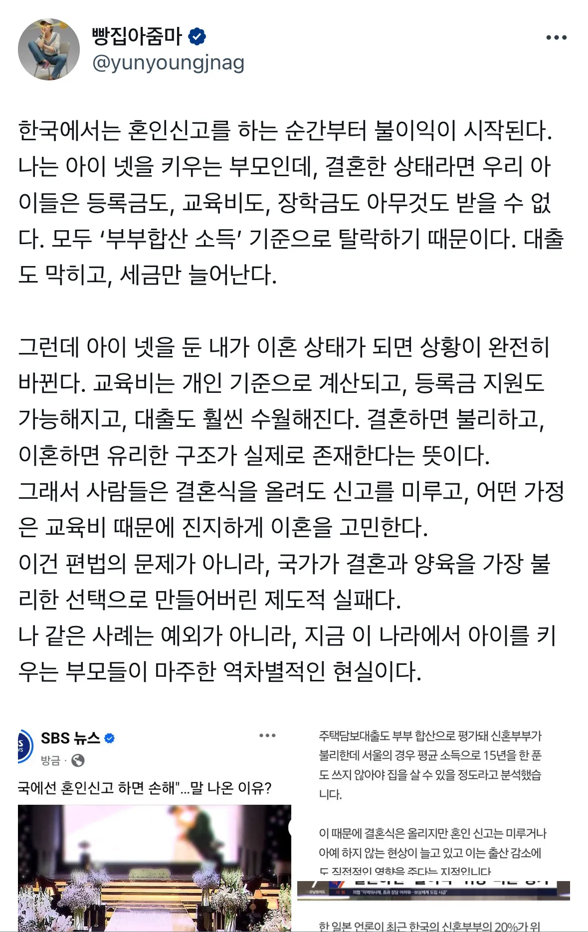 한국에서는 혼인신고를 하는 순간부터 불이익이 시작된다.