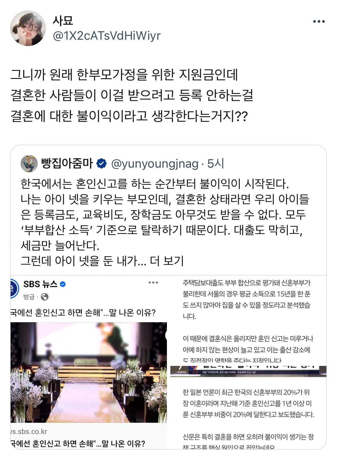 요즘 우리 동네에서 들리는 말이 있어. 혼인신고를 하자마자 불이익이 커진다는 거야. 가령 등록금이나 교육비 같은 혜택이 개인 소득 기준으로 달라지거나 대출이 더 까다로워진다던 소문이 나돈다. 나는 그럴 거라곤 확신 못하지만, 왜 이런 구조가 생겼는지 궁금하고 한편으로는 씁쓸해진다.