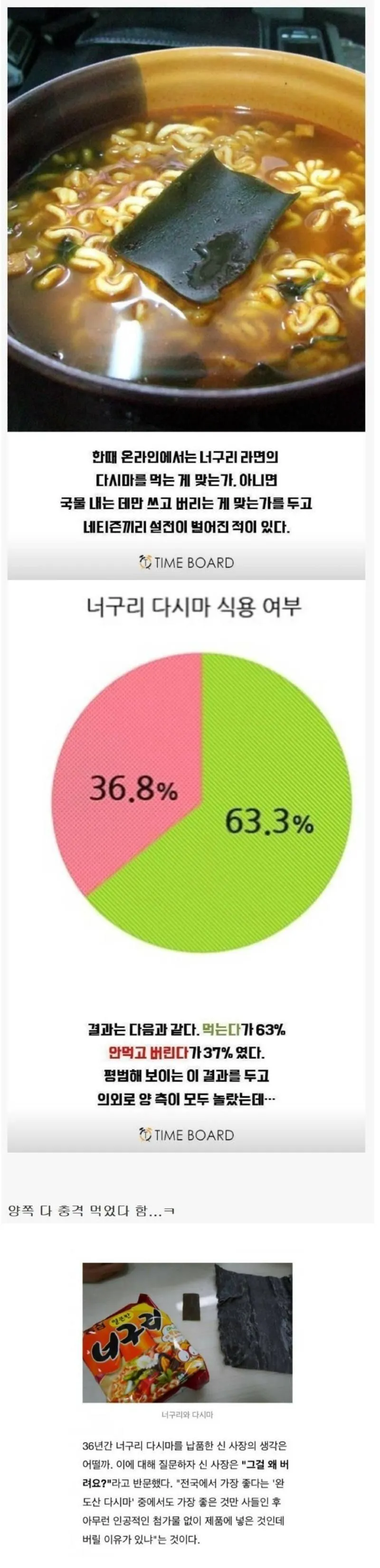 오늘 우리 동네 커뮤니티에 너구리 라면의 다시마 얘기가 또 불붙었어. 국물을 끓인 뒤 남겨둬야 하나, 아니면 처음부터 다 먹는 게 낫느냐로 논쟁이 시작됐거든. 어떤 사람은 다시마를 먹는 쪽이 국물과 함께 맛의 한 축이라고 말했고, 또 다른 쪽은 남겨진 부분을 꺼내 먹지 않는 편이 더 깔끔하다고 느꼈어. 서로의 취향 차이가 이렇게까지 불붙을 줄은 몰랐지만, 분위기는 의외로 가볍게 퍼지더라.