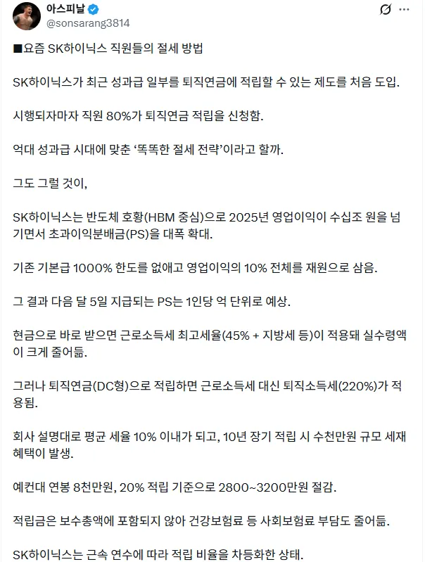다음 달 PS 지급 소식이 퍼지면서 이 제도에 대한 관심이 확 붙은 거 같아. 다른 대기업도 비슷한 제도 펼치려나, 아니면 SK하이닉스만의 움직임일지 아직은 미지수야. 영업이익이 많이 뚫려도 이 이익이 어떻게 배분되느냐에 따라 달라지는 게 많다 보니 깜빡 안심하기 어렵네. 그래도 절세 방법 얘기가 앞으로도 계속 나오면 우리도 한번쯤은 내 상황에 맞춰 생각해봐야겠다는 생각은 남아 있어.