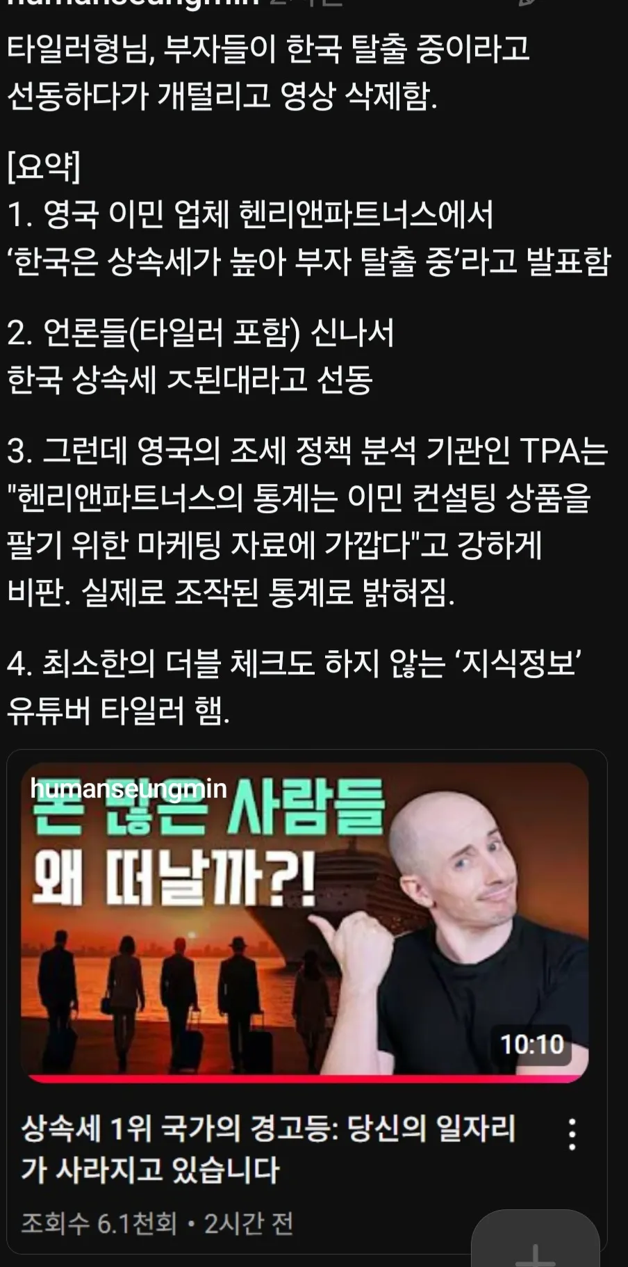 타일러 " 부자들 한국 떠난다" 영상 올렸다가 삭제