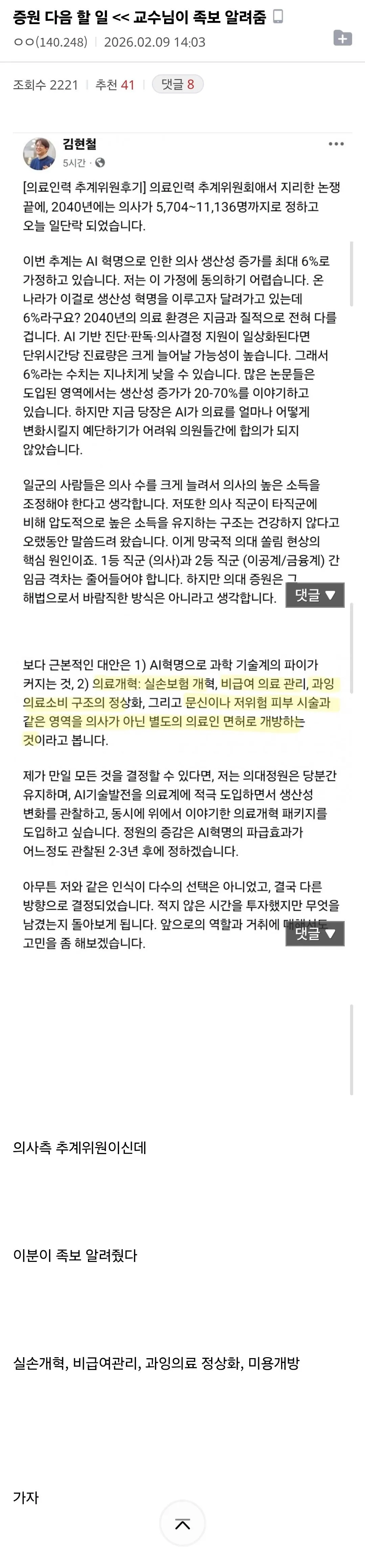 요즘 커뮤니티에서 의대 증원 이야기가 왜 이렇게 자주 떠도는지 궁금해. 누가 말하길 어떤 의대 교수님이 인력 추계 얘기를 꺼냈다나, 다음 단계가 뭔지에 대한 소문이 퍼지는 중이래. AI 얘기도 같이 붙어 다니는 걸 보니 분위기가 더 복잡해 보이고. 2040년 의사 수 추계 같은 숫자는 아직 확정된 게 아니라서 사람들 사이에 추측만 쌓이는 분위기야.