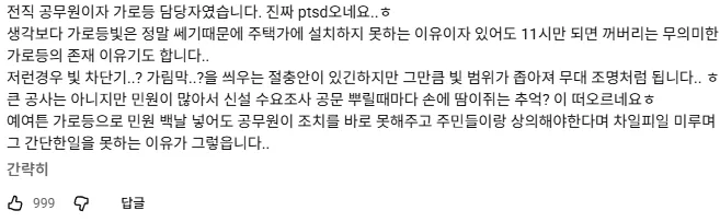결국 이 문제의 끝은 아직 보이지 않는다. 가로등의 존재 이유를 되새기며, 빛 공해를 줄이되 안전도 잃지 않는 선에서 주민들이 함께 합의하는 길을 찾고자 한다. 민원이 한두 개 쌓이길 기다리다 지치는 일이 없었으면 좋겠지만, 아직은 분위기가 모르는 사이에 흘러가고 있다. 어떻게든 이 이슈가 우리 동네의 밤을 덜 밝히고도 안전하게 남을 수 있을지, 계속 생각하게 된다.