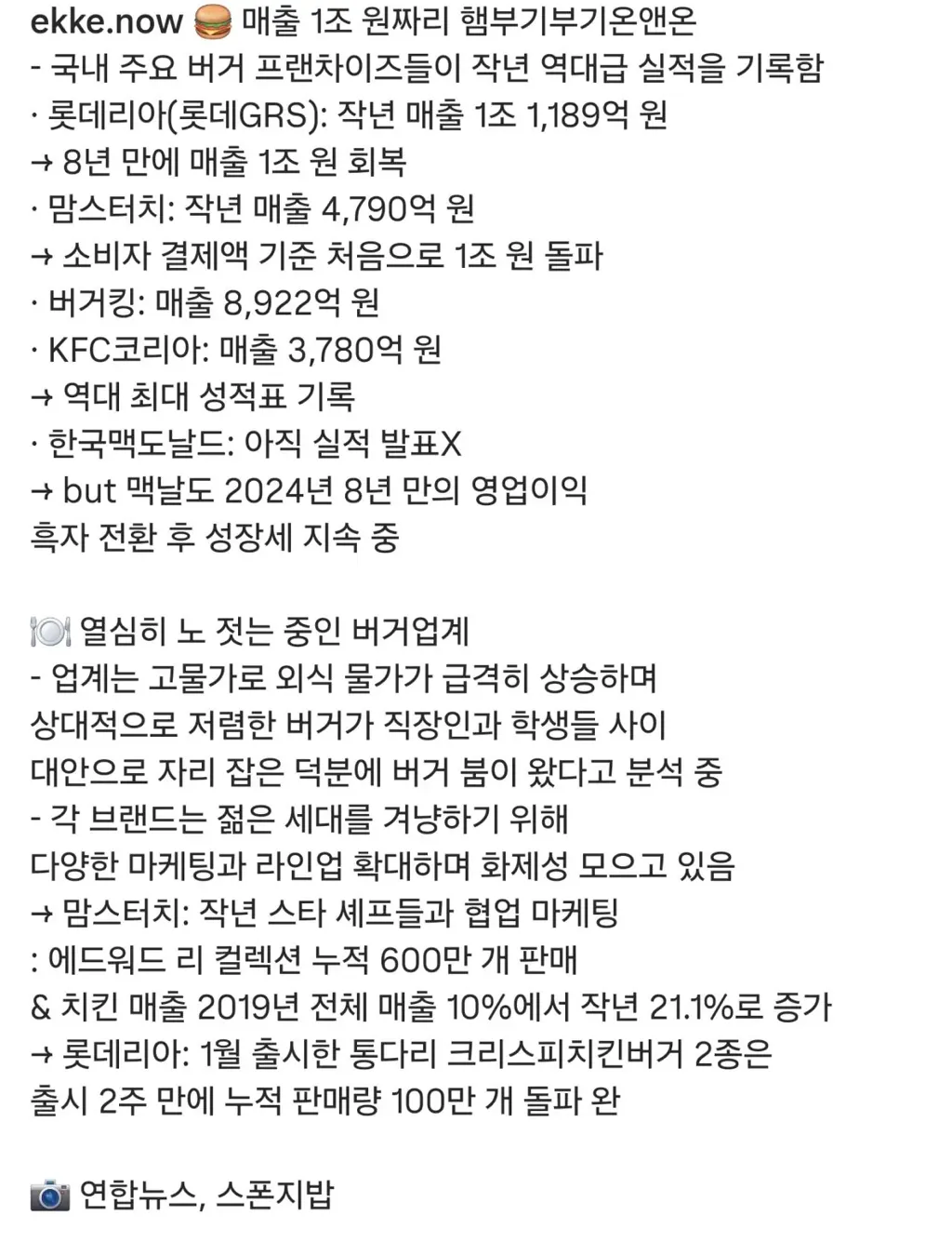 요즘 햄버거 업계 얘기가 동네 카페에서도 자주 나오더라. 소문에 따르면 작년 실적이 역대급이었다고 하고, 롯데리아가 매출 1조 원대 회복 소식도 돌고 있더라. 맘스터치도 결제액 기준으로 1조 넘었다는 말이 떠돌고 있고, 버거킹과 KFC 코리아 얘기도 함께 들려. 물가가 올랐으니 가격대가 비교적 낮은 버거가 직장인이나 학생들 사이에서 대안으로 떠올랐다고 보는 분위기야.