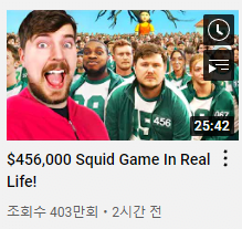 방금 뜬 7천만 구독 유튜버의 '오징어 게임' (456명 참가, 1등 약 5억원)