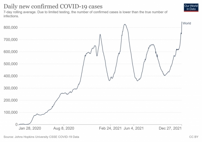 블룸버그통신은 27일 기준 전 세계 코로나19 일일 신규 확진자 수가 144만명에 달했고, 보수적 집계인 전 세계 7일 평균 확진자 수도 84만1000명이라며 "오미크론 감염의 해일로 (전 세계 확진자 수가) 사상 최고치를 기록했다"고 28일 보도했다. 아울러 오미크론 변이가 처음 보고됐던 한 달 전보다 무려 49%가 급증했다고 덧붙였다.