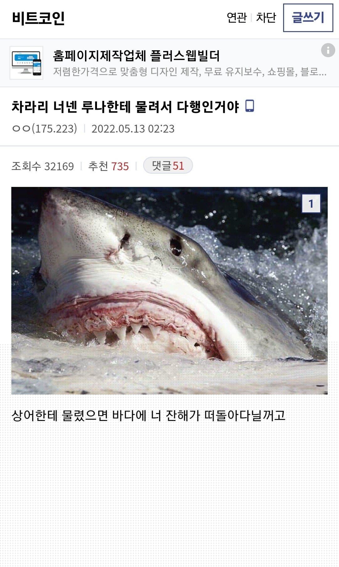 루나코인 폭락.. 코인갤러리에 나타난 현자 재미난도시락 쪽지보내기자기소개아이디로 검색전체게시물 05-13 6,097 회 0 건 대체 얼마나 잃어봤어야 이런 마인드가 가능한거냐..? 목록 이메일 주소는 공개되지 않습니다. 댓글 * 이름 * 비밀번호 * 비밀글 사용 제목 글쓴이 조회 날짜 현재 논란중인 로또 예언 달콤별 쪽지보내기자기소개아이디로 검색전체게시물 4,737 0 22-05-27 달콤별 쪽지보내기자기소개아이디로 검색전체게시물 4,737 22-05-27 갑질 안하는 배우 톰 크루즈의 반전 달콤별 쪽지보내기자기소개아이디로 검색전체게시물 4,473 0 22-05-27 달콤별 쪽지보내기자기소개아이디로 검색전체게시물 4,473 22-05-27 크리링이 드래곤볼 세계관 최강의 지구인인가?에 대한 논쟁이 있었던 부분 도레미 쪽지보내기자기소개아이디로 검색전체게시물 5,503 0 22-05-26 도레미 쪽지보내기자기소개아이디로 검색전체게시물 5,503 22-05-26 테라/루나 코인 IMF에서 인증 떴네 달콤별 쪽지보내기자기소개아이디로 검색전체게시물 4,965 0 22-05-24 달콤별 쪽지보내기자기소개아이디로 검색전체게시물 4,965 22-05-24 손흥민 미친 원더 23호골 도레미 쪽지보내기자기소개아이디로 검색전체게시물 4,562 0 22-05-23 도레미 쪽지보내기자기소개아이디로 검색전체게시물 4,562 22-05-23 충치에 대한 의외의 사실 재미난도시락 쪽지보내기자기소개아이디로 검색전체게시물 6,716 0 22-05-19 재미난도시락 쪽지보내기자기소개아이디로 검색전체게시물 6,716 22-05-19 나 47살 처럼 보여요? 몽비쥬 쪽지보내기자기소개아이디로 검색전체게시물 6,187 0 22-05-19 몽비쥬 쪽지보내기자기소개아이디로 검색전체게시물 6,187 22-05-19 5억 사기친 사기꾼에게 복수하고 자살한 사건 몽비쥬 쪽지보내기자기소개아이디로 검색전체게시물 6,482 0 22-05-18 몽비쥬 쪽지보내기자기소개아이디로 검색전체게시물 6,482 22-05-18 [펌] 강호동 탈세 논란 사건의 진실 재미난도시락 쪽지보내기자기소개아이디로 검색전체게시물 5,979 0 22-05-16 재미난도시락 쪽지보내기자기소개아이디로 검색전체게시물 5,979 22-05-16 [속보] 트위치 총기난사 사건 공식 성명 발표 재미난도시락 쪽지보내기자기소개아이디로 검색전체게시물 6,175 0 22-05-15 재미난도시락 쪽지보내기자기소개아이디로 검색전체게시물 6,175 22-05-15 ⭐ 루나코인 폭락.. 코인갤러리에 나타난 현자 재미난도시락 쪽지보내기자기소개아이디로 검색전체게시물 6,098 0 22-05-13 재미난도시락 쪽지보내기자기소개아이디로 검색전체게시물 6,098 22-05-13 최고 인기 축구 게임 FIFA 시리즈 사라진다…EA 연장 계약 불발 달콤별 쪽지보내기자기소개아이디로 검색전체게시물 4,632 0 22-05-11 달콤별 쪽지보내기자기소개아이디로 검색전체게시물 4,632 22-05-11 출시합니다! Google, Pixel Watch 이름으로 상표를 등록. 몽비쥬 쪽지보내기자기소개아이디로 검색전체게시물 6,209 0 22-04-23 몽비쥬 쪽지보내기자기소개아이디로 검색전체게시물 6,209 22-04-23 확실히 카리나 윈터 인기 압도적이구나 재미난도시락 쪽지보내기자기소개아이디로 검색전체게시물 6,874 0 22-04-22 재미난도시락 쪽지보내기자기소개아이디로 검색전체게시물 6,874 22-04-22 한달 타보고 결정하세요. 대기업 중고차 진출 클라스 몽비쥬 쪽지보내기자기소개아이디로 검색전체게시물 6,443 0 22-04-22 몽비쥬 쪽지보내기자기소개아이디로 검색전체게시물 6,443 22-04-22 Netflix, 10년 만에 처음으로 구독자 잃음, 계정 공유 탓이라고 돌리다. 도레미 쪽지보내기자기소개아이디로 검색전체게시물 6,372 0 22-04-21 도레미 쪽지보내기자기소개아이디로 검색전체게시물 6,372 22-04-21 탱크에 박은 사람의 변명 1 달콤별 쪽지보내기자기소개아이디로 검색전체게시물 6,345 1 22-04-20 달콤별 쪽지보내기자기소개아이디로 검색전체게시물 6,345 22-04-20 우크라 독도. 동해 일본해 표기...답변 없어 1 몽비쥬 쪽지보내기자기소개아이디로 검색전체게시물 6,699 1 22-04-20 몽비쥬 쪽지보내기자기소개아이디로 검색전체게시물 6,699 22-04-20 변호사가 변호를 포기하는게 현명한 경우 몽비쥬 쪽지보내기자기소개아이디로 검색전체게시물 5,430 0 22-04-15 몽비쥬 쪽지보내기자기소개아이디로 검색전체게시물 5,430 22-04-15 인터넷에 올라온 루머를 해명하는 강동원 달콤별 쪽지보내기자기소개아이디로 검색전체게시물 5,289 0 22-04-14 달콤별 쪽지보내기자기소개아이디로 검색전체게시물 5,289 22-04-14 전세계 공통사항 : 우리나라 보는 줄 몽비쥬 쪽지보내기자기소개아이디로 검색전체게시물 8,088 0 22-04-14 몽비쥬 쪽지보내기자기소개아이디로 검색전체게시물 8,088 22-04-14 예의 없는 중고나라 빌런 1 달콤별 쪽지보내기자기소개아이디로 검색전체게시물 4,673 1 22-04-14 달콤별 쪽지보내기자기소개아이디로 검색전체게시물 4,673 22-04-14 중고딩 교복 근황 1 재미난도시락 쪽지보내기자기소개아이디로 검색전체게시물 5,228 1 22-04-13 재미난도시락 쪽지보내기자기소개아이디로 검색전체게시물 5,228 22-04-13 BTS가 지금 군면제 이슈를 던지는 이유 몽비쥬 쪽지보내기자기소개아이디로 검색전체게시물 4,856 0 22-04-12 몽비쥬 쪽지보내기자기소개아이디로 검색전체게시물 4,856 22-04-12 치킨가격