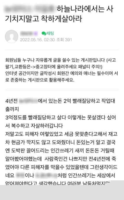 5억 사기친 사기꾼에게 복수하고 자살한 사건 몽비쥬 쪽지보내기자기소개아이디로 검색전체게시물 05-18 6,481 회 0 건 인천 오토바이 살인사건 이라고 검색하면 기사 나오네요 5억 사기친 오토바이 매장 사장을 살해하고(복수)자살했네요ㄷㄷㄷhttps://n.news.naver.com/article/003/0011190813 목록 이메일 주소는 공개되지 않습니다. 댓글 * 이름 * 비밀번호 * 비밀글 사용 제목 글쓴이 조회 날짜 현재 논란중인 로또 예언 달콤별 쪽지보내기자기소개아이디로 검색전체게시물 4,737 0 22-05-27 달콤별 쪽지보내기자기소개아이디로 검색전체게시물 4,737 22-05-27 갑질 안하는 배우 톰 크루즈의 반전 달콤별 쪽지보내기자기소개아이디로 검색전체게시물 4,473 0 22-05-27 달콤별 쪽지보내기자기소개아이디로 검색전체게시물 4,473 22-05-27 크리링이 드래곤볼 세계관 최강의 지구인인가?에 대한 논쟁이 있었던 부분 도레미 쪽지보내기자기소개아이디로 검색전체게시물 5,503 0 22-05-26 도레미 쪽지보내기자기소개아이디로 검색전체게시물 5,503 22-05-26 테라/루나 코인 IMF에서 인증 떴네 달콤별 쪽지보내기자기소개아이디로 검색전체게시물 4,965 0 22-05-24 달콤별 쪽지보내기자기소개아이디로 검색전체게시물 4,965 22-05-24 손흥민 미친 원더 23호골 도레미 쪽지보내기자기소개아이디로 검색전체게시물 4,562 0 22-05-23 도레미 쪽지보내기자기소개아이디로 검색전체게시물 4,562 22-05-23 충치에 대한 의외의 사실 재미난도시락 쪽지보내기자기소개아이디로 검색전체게시물 6,716 0 22-05-19 재미난도시락 쪽지보내기자기소개아이디로 검색전체게시물 6,716 22-05-19 나 47살 처럼 보여요? 몽비쥬 쪽지보내기자기소개아이디로 검색전체게시물 6,187 0 22-05-19 몽비쥬 쪽지보내기자기소개아이디로 검색전체게시물 6,187 22-05-19 ⭐ 5억 사기친 사기꾼에게 복수하고 자살한 사건 몽비쥬 쪽지보내기자기소개아이디로 검색전체게시물 6,482 0 22-05-18 몽비쥬 쪽지보내기자기소개아이디로 검색전체게시물 6,482 22-05-18 [펌] 강호동 탈세 논란 사건의 진실 재미난도시락 쪽지보내기자기소개아이디로 검색전체게시물 5,979 0 22-05-16 재미난도시락 쪽지보내기자기소개아이디로 검색전체게시물 5,979 22-05-16 [속보] 트위치 총기난사 사건 공식 성명 발표 재미난도시락 쪽지보내기자기소개아이디로 검색전체게시물 6,175 0 22-05-15 재미난도시락 쪽지보내기자기소개아이디로 검색전체게시물 6,175 22-05-15 루나코인 폭락.. 코인갤러리에 나타난 현자 재미난도시락 쪽지보내기자기소개아이디로 검색전체게시물 6,097 0 22-05-13 재미난도시락 쪽지보내기자기소개아이디로 검색전체게시물 6,097 22-05-13 최고 인기 축구 게임 FIFA 시리즈 사라진다…EA 연장 계약 불발 달콤별 쪽지보내기자기소개아이디로 검색전체게시물 4,632 0 22-05-11 달콤별 쪽지보내기자기소개아이디로 검색전체게시물 4,632 22-05-11 출시합니다! Google, Pixel Watch 이름으로 상표를 등록. 몽비쥬 쪽지보내기자기소개아이디로 검색전체게시물 6,208 0 22-04-23 몽비쥬 쪽지보내기자기소개아이디로 검색전체게시물 6,208 22-04-23 확실히 카리나 윈터 인기 압도적이구나 재미난도시락 쪽지보내기자기소개아이디로 검색전체게시물 6,874 0 22-04-22 재미난도시락 쪽지보내기자기소개아이디로 검색전체게시물 6,874 22-04-22 한달 타보고 결정하세요. 대기업 중고차 진출 클라스 몽비쥬 쪽지보내기자기소개아이디로 검색전체게시물 6,443 0 22-04-22 몽비쥬 쪽지보내기자기소개아이디로 검색전체게시물 6,443 22-04-22 Netflix, 10년 만에 처음으로 구독자 잃음, 계정 공유 탓이라고 돌리다. 도레미 쪽지보내기자기소개아이디로 검색전체게시물 6,372 0 22-04-21 도레미 쪽지보내기자기소개아이디로 검색전체게시물 6,372 22-04-21 탱크에 박은 사람의 변명 1 달콤별 쪽지보내기자기소개아이디로 검색전체게시물 6,345 1 22-04-20 달콤별 쪽지보내기자기소개아이디로 검색전체게시물 6,345 22-04-20 우크라 독도. 동해 일본해 표기...답변 없어 1 몽비쥬 쪽지보내기자기소개아이디로 검색전체게시물 6,699 1 22-04-20 몽비쥬 쪽지보내기자기소개아이디로 검색전체게시물 6,699 22-04-20 변호사가 변호를 포기하는게 현명한 경우 몽비쥬 쪽지보내기자기소개아이디로 검색전체게시물 5,430 0 22-04-15 몽비쥬 쪽지보내기자기소개아이디로 검색전체게시물 5,430 22-04-15 인터넷에 올라온 루머를 해명하는 강동원 달콤별 쪽지보내기자기소개아이디로 검색전체게시물 5,289 0 22-04-14 달콤별 쪽지보내기자기소개아이디로 검색전체게시물 5,289 22-04-14 전세계 공통사항 : 우리나라 보는 줄 몽비쥬 쪽지보내기자기소개아이디로 검색전체게시물 8,088 0 22-04-14 몽비쥬 쪽지보내기자기소개아이디로 검색전체게시물 8,088 22-04-14 예의 없는 중고나라 빌런 1 달콤별 쪽지보내기자기소개아이디로 검색전체게시물 4,672 1 22-04-14 달콤별 쪽지보내기자기소개아이디로 검색전체게시물 4,672 22-04-14 중고딩 교복 근황 1 재미난도시락 쪽지보내기자기소개아이디로 검색전체게시물 5,228 1 22-04-13 재미난도시락 쪽지보내기자기소개아이디로 검색전체게시물 5,228 22-04-13 BTS가 지금 군면제 이슈를 던지는 이유 몽비쥬 쪽지보내기자기소개아이디로 검
