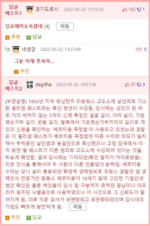 지문등록시스템이 생긴 이유 몽비쥬 쪽지보내기자기소개아이디로 검색전체게시물 05-29 4,537 회 0 건 동명동성, 똑같이 생김 (가족아님)1903년 윌 웨스트가 교도소에 가기 위해 신원확인 도중 동명동성의 똑깥이 생긴 수감자가 있었음당시에 신원확인을 사진으로하던 시대에 이 우연의 일치로 지문 등록을 하기 시작함 목록 이메일 주소는 공개되지 않습니다. 댓글 * 이름 * 비밀번호 * 비밀글 사용 제목 글쓴이 조회 날짜 중국 부동산발 위기 시작되나? ..투신 소동잇따라 도레미 쪽지보내기자기소개아이디로 검색전체게시물 3,961 0 22-08-07 도레미 쪽지보내기자기소개아이디로 검색전체게시물 3,961 22-08-07 대형 로펌의 우영우 변호사도 피해가지 못한... 재미난도시락 쪽지보내기자기소개아이디로 검색전체게시물 4,717 0 22-08-07 재미난도시락 쪽지보내기자기소개아이디로 검색전체게시물 4,717 22-08-07 대한민국 예능이 망하기 시작한 시점 도레미 쪽지보내기자기소개아이디로 검색전체게시물 4,564 0 22-08-03 도레미 쪽지보내기자기소개아이디로 검색전체게시물 4,564 22-08-03 변호사가 말하는 현실판 우영우 재미난도시락 쪽지보내기자기소개아이디로 검색전체게시물 4,107 0 22-08-02 재미난도시락 쪽지보내기자기소개아이디로 검색전체게시물 4,107 22-08-02 무적의 '반창고 백신' 나오나…'오미크론까지 19종 변이에 효과' 몽비쥬 쪽지보내기자기소개아이디로 검색전체게시물 3,916 0 22-07-29 몽비쥬 쪽지보내기자기소개아이디로 검색전체게시물 3,916 22-07-29 과수원을 하다 수천억원대 부자가 된 부부 몽비쥬 쪽지보내기자기소개아이디로 검색전체게시물 4,483 0 22-07-28 몽비쥬 쪽지보내기자기소개아이디로 검색전체게시물 4,483 22-07-28 소녀시대는 완전히 끝났구나 달콤별 쪽지보내기자기소개아이디로 검색전체게시물 6,534 0 22-07-28 달콤별 쪽지보내기자기소개아이디로 검색전체게시물 6,534 22-07-28 1950년대 한국 컬러 사진 도레미 쪽지보내기자기소개아이디로 검색전체게시물 4,315 0 22-07-25 도레미 쪽지보내기자기소개아이디로 검색전체게시물 4,315 22-07-25 폴란드 공군 장성이 밝힌 FA-50 도입 관련 이야기 달콤별 쪽지보내기자기소개아이디로 검색전체게시물 4,299 0 22-07-23 달콤별 쪽지보내기자기소개아이디로 검색전체게시물 4,299 22-07-23 안드로이드 노바 런처, 데이터 측정 업체 브랜치가 인수 달콤별 쪽지보내기자기소개아이디로 검색전체게시물 4,395 0 22-07-20 달콤별 쪽지보내기자기소개아이디로 검색전체게시물 4,395 22-07-20 법원이 LCT 레지던스 주거는 불법인데 주거권을 인정해줬습니다. 달콤별 쪽지보내기자기소개아이디로 검색전체게시물 4,518 0 22-07-17 달콤별 쪽지보내기자기소개아이디로 검색전체게시물 4,518 22-07-17 포터 vs 포르쉐 몽비쥬 쪽지보내기자기소개아이디로 검색전체게시물 4,410 0 22-07-17 몽비쥬 쪽지보내기자기소개아이디로 검색전체게시물 4,410 22-07-17 125조 투입 원금에 90프로 빚탕감 정책나왔네요.. 몽비쥬 쪽지보내기자기소개아이디로 검색전체게시물 4,651 0 22-07-15 몽비쥬 쪽지보내기자기소개아이디로 검색전체게시물 4,651 22-07-15 미항공우주국 NASA는 PC에 동조하지 않았음.. 도레미 쪽지보내기자기소개아이디로 검색전체게시물 3,985 0 22-07-13 도레미 쪽지보내기자기소개아이디로 검색전체게시물 3,985 22-07-13 연매출 165억 약국 CEO 누나 재미난도시락 쪽지보내기자기소개아이디로 검색전체게시물 4,597 0 22-07-13 재미난도시락 쪽지보내기자기소개아이디로 검색전체게시물 4,597 22-07-13 군대 가겠다고 하고 외국으로 튄 석현준 근황 달콤별 쪽지보내기자기소개아이디로 검색전체게시물 4,362 0 22-07-10 달콤별 쪽지보내기자기소개아이디로 검색전체게시물 4,362 22-07-10 안동 칼부림 사건 전말 도레미 쪽지보내기자기소개아이디로 검색전체게시물 5,644 0 22-07-08 도레미 쪽지보내기자기소개아이디로 검색전체게시물 5,644 22-07-08 28살 신인 여배우의 첫 방한 도레미 쪽지보내기자기소개아이디로 검색전체게시물 5,257 0 22-07-08 도레미 쪽지보내기자기소개아이디로 검색전체게시물 5,257 22-07-08 국제적 바보가 되어버린 채연 도레미 쪽지보내기자기소개아이디로 검색전체게시물 9,191 0 22-06-30 도레미 쪽지보내기자기소개아이디로 검색전체게시물 9,191 22-06-30 대한민국 라면계에서 사라져야 할 악습 재미난도시락 쪽지보내기자기소개아이디로 검색전체게시물 5,264 0 22-06-29 재미난도시락 쪽지보내기자기소개아이디로 검색전체게시물 5,264 22-06-29 개그판에서 코미디빅리그만 살아남은 이유 몽비쥬 쪽지보내기자기소개아이디로 검색전체게시물 4,768 0 22-06-28 몽비쥬 쪽지보내기자기소개아이디로 검색전체게시물 4,768 22-06-28 국가대표 선출 플랭크 대결 ㄷㄷㄷㄷ 몽비쥬 쪽지보내기자기소개아이디로 검색전체게시물 4,460 0 22-06-27 몽비쥬 쪽지보내기자기소개아이디로 검색전체게시물 4,460 22-06-27 골목식당 덮죽 사장님 근황 도레미 쪽지보내기자기소개아이디로 검색전체게시물 4,634 0 22-06-24 도레미 쪽지보내기자기소개아이디로 검색전체게시물 4,634 22-06-24 미국에서 72년간 교도소 수감중인 살인자 도레미 쪽지보내기자기소개아이디로 검색전체게시