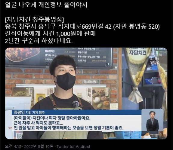 한 고객은 2022년 8월 10일 오전 4시 13분에 Twitter for Android에서 "얼굴이 나오게 개인정보를 푸는건 맞지롱"이라는 글을 올렸는데, 이는 자담치킨 청주봉명점의 ABLEM 4(E) 9시 52분에 올라온 후기 중 하나입니다. 이 고객은 자담치킨이 항상 유혹적이며 맛있다고 언급하였습니다.