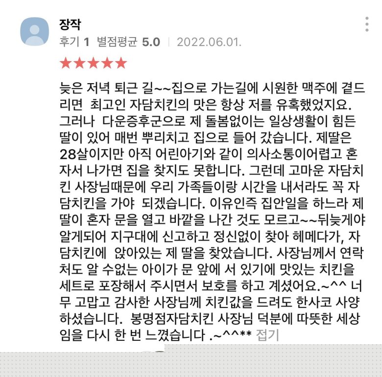 또한 다른 손님은 자담치킨의 맛이 항상 저를 유혹했지만, 다운증후군을 앓는 딸 때문에 매번 뿌리치고 집으로 돌아가야했다고 말했습니다. 그러나 자담치킨 청주봉명점의 점주인 덕분에 가족들과 함께 시간을 내서라도 자담치킨을 가고 싶다고 했습니다. 그 이유는 딸이 혼자 집을 나가는 일이 발생하였고, 뒤늦게 알게되어 지구대에 신고하고 여기저기 찾아다니다가 자담치킨에서 딸을 찾았다고 말했습니다. 사장님께서는 아이가 보호를 받을 수 있도록 맛있는 치킨을 세트로 포장해 주셨다고 합니다. 이에 대해 고마웠던 손님은 치킨값을 지불하려고 했으나, 점주인은 사양하셨다고 합니다. 마지막으로 이 고객은 자담치킨 청주봉명점 사장님 덕분에 따뜻한 세상임을 다시 한 번 느꼈다고 말했습니다.