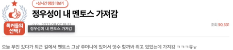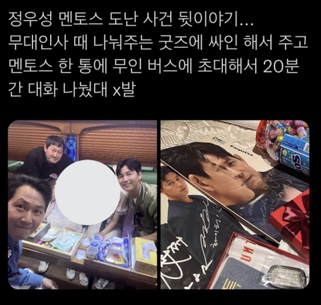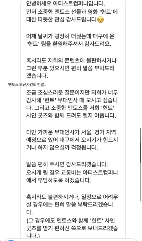 톡커들의 선택! 실시간 랭킹을 확인하고 더 알아보세요. 최근에는 정우성이 내 멘토스를 가져갔다는 소식이 돌고 있는데요. 오늘은 무인 매장에 갔다가 퇴근 길에 멘토스를 주머니에 넣어놓고 있었는데, 혹시 모르니까 가져가버렸다고 합니다. 50 안녕하세요, 아티스트컴퍼니입니다. 먼저 멘토스 선물과 영화 '헌트'에 대한 관심에 감사드리며, 대구에서 개최되는 '헌트' 팀을 환영해주신 점에도 감사드립니다. 혹시라도 불편한 점이 있다면 언제든 말씀해주시기 바랍니다. 멘토스 도난 사건에 대해서 알려드릴게요. 조심스러운 질문이지만, 멘토스를 '헌트' 무대인사 때 모셔주실 수 있을지 여쭙고 싶습니다. 또한, 멘토스를 '헌트' 사인 굿즈와 함께 드려도 되는지 알고 싶습니다. 다만, 무대 인사가 서울과 경기 지역에서 예정되어 있어 대구에서 오시기 어려우신 분들도 있을 것 같아 걱정이 됩니다. 어떻게 생각하시는지 말씀해주시면 고맙겠습니다. 만약 오시게 된다면 교통비는 저희가 부담하도록 하겠습니다. 그러나 일정이나 불편한 사항이 있으면 말씀해주시기 바랍니다. (이 경우에도 멘토스와 함께 '헌트' 사인 굿즈를 받기 편한 방법으로 보내드리겠습니다.) 50,331번 조회된 정우성의 멘토스 도난 사건의 뒷이야기입니다. 무대 인사 때 나눠주는 굿즈에 싸인을 해주고 멘토스 한 통을 무인 버스에 초대해서 20분 동안 대화를 나눴다고 합니다.