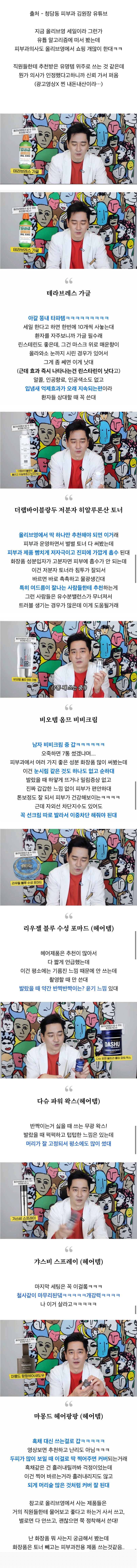 피부과 의사도 쟁여놓고 사용하는 올리브영 무알코올 가글이다. 올리브영이 세일을 하고 있는데, 유튜브에서 올리브영을 추천해주는 피부과 의사가 있었다. 그래서 지금 올리브영에서 세일을 한다고 해서 유튜브 알고리즘에 떠서 확인해봤는데, 피부과 의사도 올리브영에서 많이 쇼핑한 것 같다. 의사가 추천한 유명한 제품을 위주로 사용한다고 하니까 믿음이 간다. 올리브영에서 구매한 제품 중에는 'hera Break EASTERED ORAL RINSE'와 'hera Brean FRESH BREATH ORAL RINSE'가 있는데, 이 제품들은 아갈똥내 타파에 좋다고 한다. 세일 때는 한 번에 10개씩 사놓는 사람들이 많다고 한다. 린스테린도 좋지만, 마스크 위로 매운 향이 올라와 눈까지 시릴 때가 있는데, 이 제품은 그것보다 좋다고 한다. 알코올, 인공향료, 인공색소도 없고 입냄새 억제 효과가 오래 지속되기 때문에, 피부과에서 환자들을 상대할 때 자주 사용한다고 한다. 다음으로 추천된 제품은 '더랩바이블랑두 저분자 히알루론산 토너 BB'이다. 이 제품은 피부과 의사가 운영하면서 많은 토너를 사용해봤지만, 피부과 제품을 뺨치게 저자극이고 진피에 가깝게 흡수된다고 한다. 이 제품은 고분자 성분이 아닌 저분자 성분이 들어있어 피부에 빠르게 흡수되기 때문에 사용하면 촉촉한 물광 피부를 얻을 수 있다. 특히 여드름이 잘 나는 사람들에게도 추천된다. 또 다른 추천 제품은 '비오템 옴므 BB크림'이다. 올리브영에서 판매되는 이 제품은 피부과에서 여러 가지 좋은 성분 화장품을 사용해봤지만, 이 제품을 사용하면 눈시림 같은 불편함이 없다고 한다. 마지막으로 추천된 제품은 'REUZEL 남자 비비크림'인데, 피부과 의사도 7통을 썼을 만큼 좋다고 한다. 피부과에서 많이 사용하는 좋은 성분 화장품 중에 이 제품도 포함되어 있다.