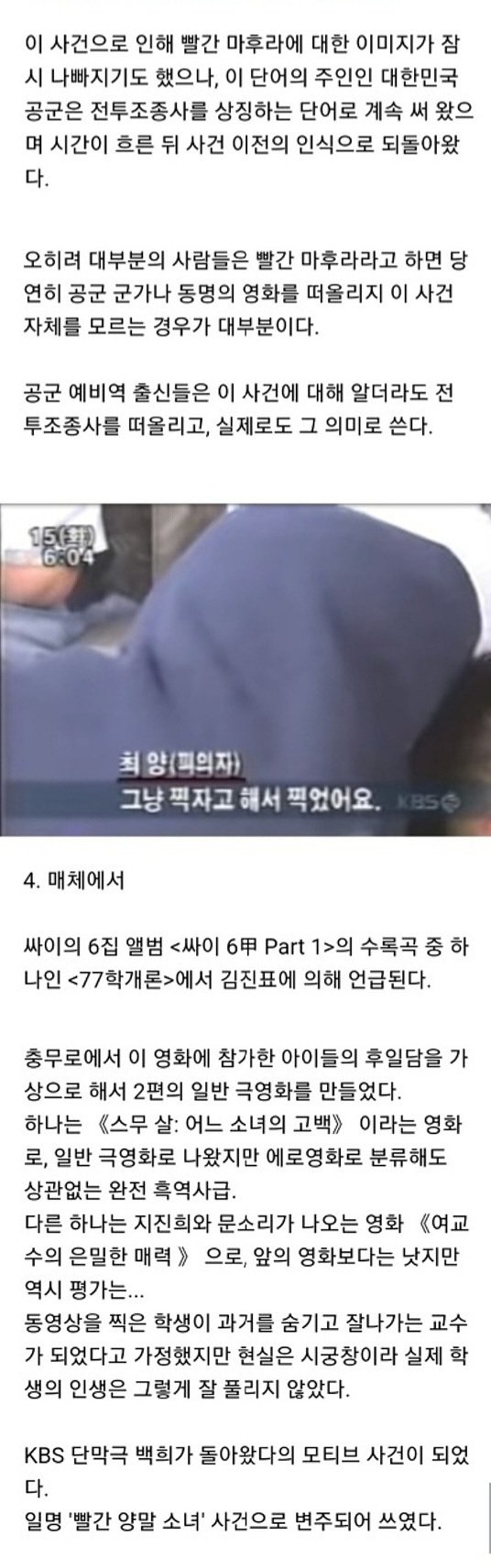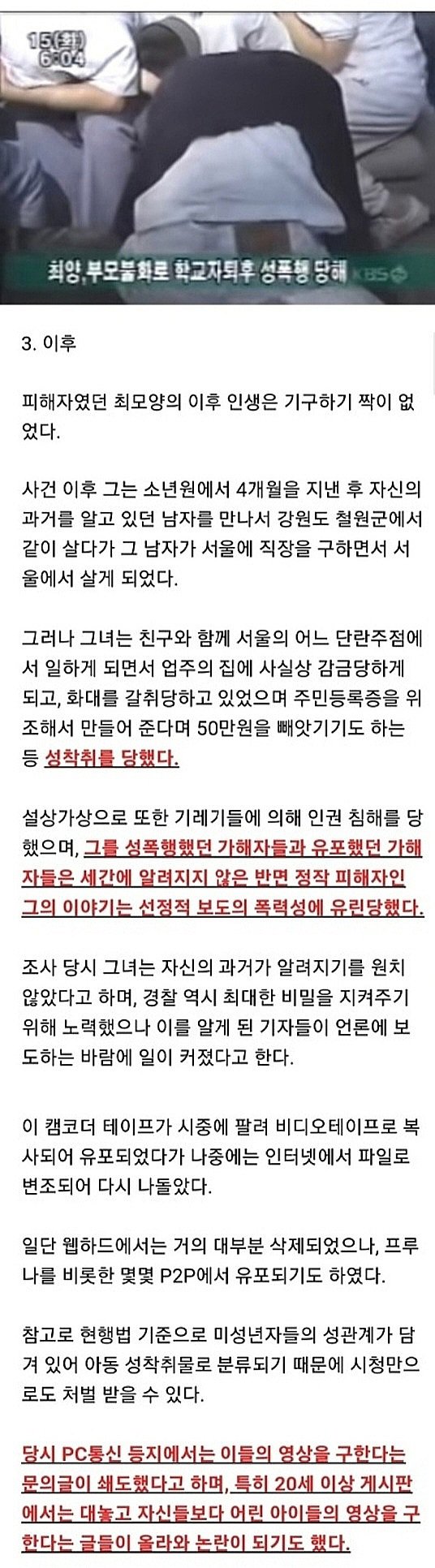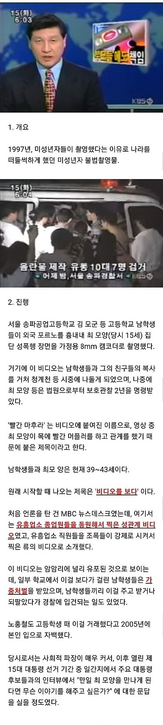 1997년에는 미성년자 불법촬영물이 제작되어 사회적으로 큰 파장을 일으켰다. 서울 송파공업고등학교 김 모군 등 고등학교 남학생들이 외국 포르노를 흉내내며 집단 성폭행 장면을 촬영하였다. 이 비디오는 남학생들과 그의 친구들 사이에서 복사되어 청계천 등에 유포되었다. 최 모양과 같은 학생들은 법원으로부터 보호관찰을 받았다. 비디오는 '빨간 마후라'라는 이름이 붙여졌고, 최 모양이 목에 빨간 머플러를 하며 관계를 하는 장면이 있어서 그 제목이 되었다. 현재 남학생들과 최 모양은 39~43세이다. 처음 언론에서는 유흥업소 종업원들을 동원하여 찍은 성관계 비디오로 소개되었고, 음란물 제작 유통 10대 7명이 검거되었다. 어떤 학교에서는 이 비디오를 보다가 걸린 남학생들이 중처벌을 받았고, 남학생들끼리 비디오를 주고 받거나 팔다가 경찰에 입건되는 사례도 있었다. 노홍철도 고등학생 때 이 비디오를 거래했다고 자백했다. 해당 사건은 매우 큰 사회적 파장을 일으켜서 대통령 후보들의 인터뷰에서도 이에 관련된 질문이 나왔다. 이후 피해자인 최 모양의 인생은 어려웠다. 사건 이후 그는 소년원에서 4개월을 보낸 후 과거 알고 있던 남자를 만나서 함께 살게 되었고, 남자가 서울에서 직장을 구하면서 그들은 서울에서 살게 되었다.
