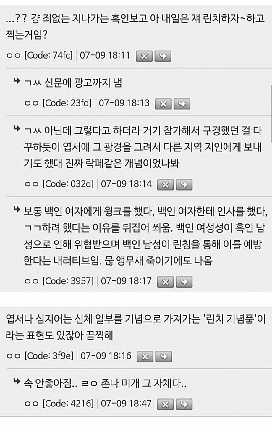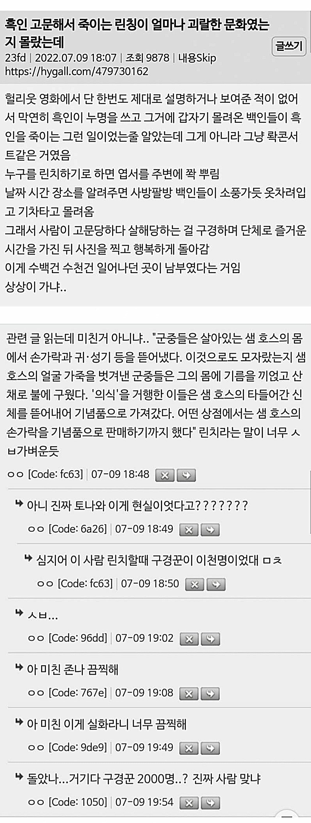 아픈 기억을 정리해드리겠습니다. 이 글에서는 흑인에 대한 혐오와 폭력을 담은 린칭이 얼마나 괴롭고 이상한 문화였는지 언급되고 있습니다. 이와 관련된 영화나 정보가 부족하여 흑인에게 무고한 누명을 쓴 후 백인들이 그를 고문하고 죽이는 일이 있었다고 생각했지만, 실제로는 롹 콘서트와 같은 행사였던 것으로 밝혀졌습니다. 린칭 대상을 정해놓으면 엽서로 주변에 알리고 사람들이 소풍 가듯이 찾아와 고문과 살해를 구경한 뒤에는 사진을 찍고 행복하게 돌아갔다고 합니다. 이런 일들은 남부에서 많이 발생했으며, 관련 글을 읽으면서 상상이 가지 않는 충격을 받았습니다. 린칭을 통해 흑인에 대한 모욕과 폭력이 이뤄졌다는 것에 화가 났습니다. 이 글에서는 살아있는 인간의 신체를 훼손하고, 얼굴 가죽을 벗겼으며, 불에 구워 몸을 태웠다고 설명되어 있습니다. 이들은 샘 호스의 신체 부분을 기념품으로 가져갔고, 일부 상점에서는 그의 손가락을 판매하기까지 했습니다. 이 사건은 너무나 가혹하고 충격적이며, 린칭이라는 단어가 이렇게 가벼운 것 같다는 생각이 듭니다. 일어났던 이 사건을 알게 된 것에 큰 충격을 받았습니다. 구경꾼으로 찾아온 사람들도 믿기 힘들 정도로 많았다고 합니다. 이 사건의 현실성에 대해 정말 충격받았고, 이런 일이 정말로 있었다니 참으로 끔찍합니다. 나 자신이 정신을 잃은 것일까요? 더욱 끔찍한 점은 이것을 구경하는 수천 명의 사람이 있었다는 것입니다. 이 사건은 1890년 이후 남부 백인들 사이에서 계속해서 발생했던 것으로 알려져 있습니다.