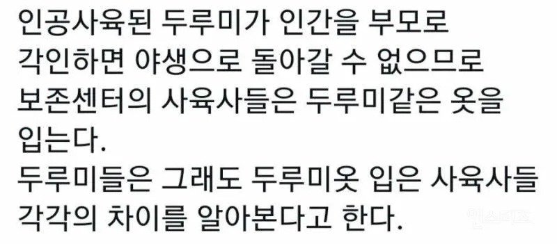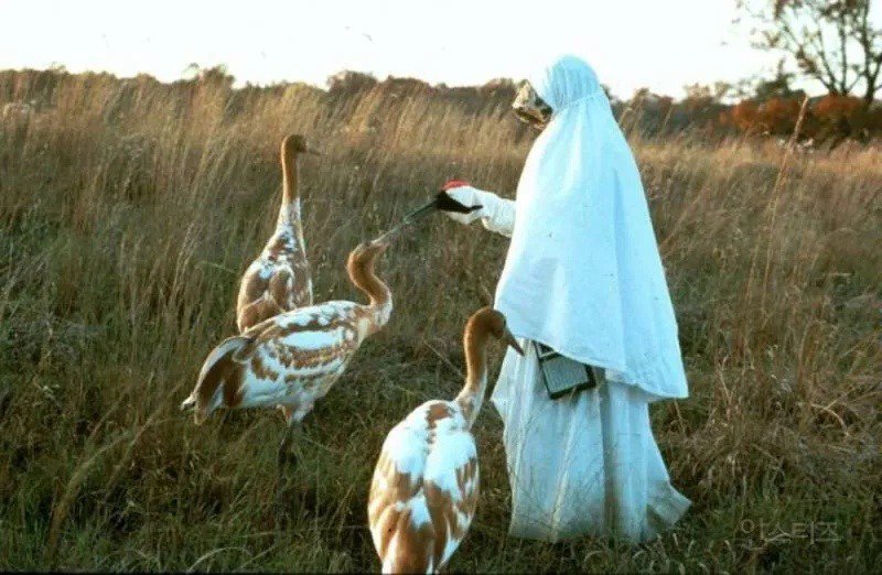 이 글은 인공사육된 두루미들이 인간을 부모로 각인하게 되어야만 야생으로 돌아갈 수 없기 때문에, 보존센터의 사육사들이 두루미들과 비슷한 옷을 입는다는 내용입니다. 그리고 두루미들은 이렇게 옷을 입은 사육사들의 차이를 알아본다고 합니다.