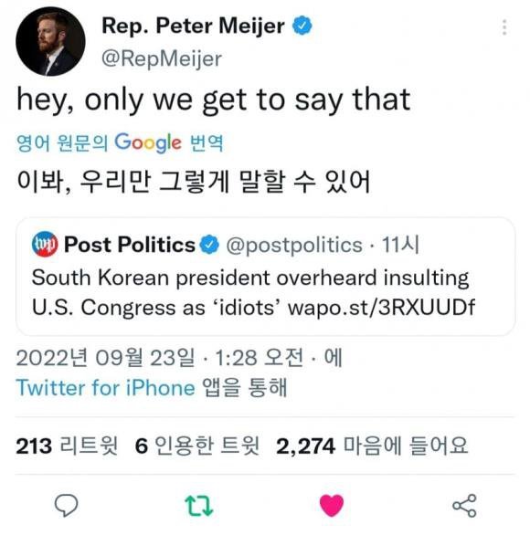 -미 상원의원 피터 마이저(@RepMeijer)는 한국 대통령이 미국 의회를 "바보들"이라고 모욕한 것에 대해 반박하는 트윗을 게시했습니다.