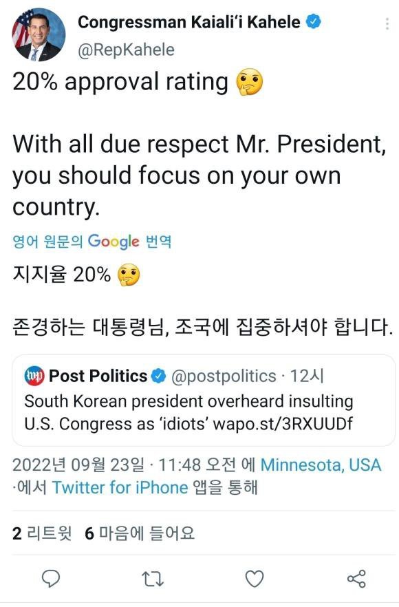 -한국 대통령의 발언은 워싱턴포스트의 기사의 주제가 되었고, 이 기사는 미 상원의원 카이알리 카헬레(@RepKahele)의 반응 트윗을 인용했습니다.