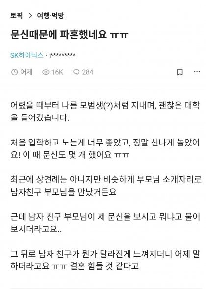 "여행.먹방 문신때문에 파혼했네요 ㅠㅠ"