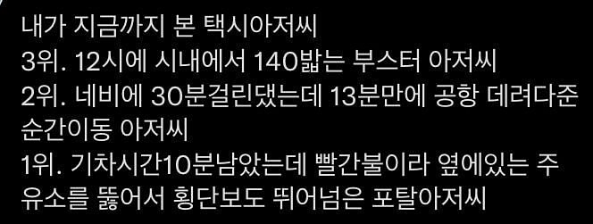 일단, 제가 기차나 버스를 타야하는데 출발 시간이 몇 분 남았을 때 "가능할까요?"라고 물어봐야 합니다. 그리고 이렇게 시간이 빠듯한 상황에서는 조심해야 합니다. 저는 지금까지 본 택시 기사들 중 3위를 차지한 아저씨가 있습니다. 이 아저씨는 12시에 시내에서 140km를 초과하는 속도로 운전하는 부스터 아저씨입니다.