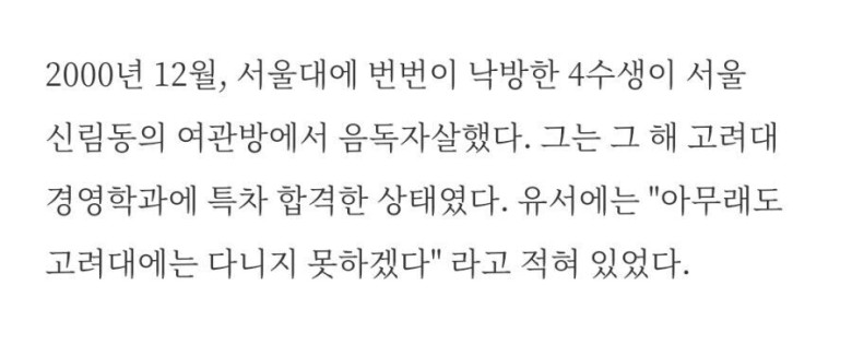 서울대에 낙방한 4수생.jpg 재미난도시락 쪽지보내기자기소개아이디로 검색전체게시물 10-03 5,775 회 0 건 집안에서의 압박이 느껴지네요... 2000년 12월에 한 서울대 4수생이 서울 신림동의 여관방에서 음독자살한 사건이 발생했습니다. 이 학생은 해당 해에 고려대 경영학과에 특별전형으로 합격한 상태였습니다. 그의 유서에는 "아무래도 고려대에는 다니지 못하겠다"라고 적혀 있었습니다. 목록 이메일 주소는 공개되지 않습니다. 댓글 * 이름 * 비밀번호 * 비밀글 사용 제목 글쓴이 조회 날짜 정직한 컴퓨터 가게가 겪는 곤란한 상황.jpg 옆집총각 쪽지보내기자기소개아이디로 검색전체게시물 5,088 0 22-10-09 옆집총각 쪽지보내기자기소개아이디로 검색전체게시물 5,088 22-10-09 거대 브랜드들의 초라했던 1호점 시절 얼음사이다 쪽지보내기자기소개아이디로 검색전체게시물 5,512 0 22-10-08 얼음사이다 쪽지보내기자기소개아이디로 검색전체게시물 5,512 22-10-08 첫데이트에 싸구려 식당 좀 가지마 옆집총각 쪽지보내기자기소개아이디로 검색전체게시물 6,286 0 22-10-08 옆집총각 쪽지보내기자기소개아이디로 검색전체게시물 6,286 22-10-08 군대 FM 병사의 말로 밝은횃불 쪽지보내기자기소개아이디로 검색전체게시물 5,996 0 22-10-08 밝은횃불 쪽지보내기자기소개아이디로 검색전체게시물 5,996 22-10-08 비싼 선물을 사줬더니..이선희 가족들이 이선희에게 한 말 재미난도시락 쪽지보내기자기소개아이디로 검색전체게시물 5,184 0 22-10-08 재미난도시락 쪽지보내기자기소개아이디로 검색전체게시물 5,184 22-10-08 미국 인플레이션 감축법의 진실 세계는지금 쪽지보내기자기소개아이디로 검색전체게시물 4,946 0 22-10-07 세계는지금 쪽지보내기자기소개아이디로 검색전체게시물 4,946 22-10-07 중학생 '무면허' 킥보드에... 80대 여성의 '황망한 죽음.. 1 아시가루 쪽지보내기자기소개아이디로 검색전체게시물 5,103 1 22-10-07 아시가루 쪽지보내기자기소개아이디로 검색전체게시물 5,103 22-10-07 세계 3위, 한국 프라모델 업체 1 몽비쥬 쪽지보내기자기소개아이디로 검색전체게시물 5,105 1 22-10-07 몽비쥬 쪽지보내기자기소개아이디로 검색전체게시물 5,105 22-10-07 열차표 '18억 어치' 샀다가 환불…왜 이런 일 벌어지나? 지니까꿍 쪽지보내기자기소개아이디로 검색전체게시물 5,182 0 22-10-06 지니까꿍 쪽지보내기자기소개아이디로 검색전체게시물 5,182 22-10-06 손헌수 가족의 박수홍 대접 몽비쥬 쪽지보내기자기소개아이디로 검색전체게시물 4,892 0 22-10-06 몽비쥬 쪽지보내기자기소개아이디로 검색전체게시물 4,892 22-10-06 최근 우크라이나가 득템한 장비.jpg 도레미 쪽지보내기자기소개아이디로 검색전체게시물 5,086 0 22-10-06 도레미 쪽지보내기자기소개아이디로 검색전체게시물 5,086 22-10-06 100년의 가게142년의 역사 코르크 마개...제작과정.jpg 밝은횃불 쪽지보내기자기소개아이디로 검색전체게시물 4,935 0 22-10-05 밝은횃불 쪽지보내기자기소개아이디로 검색전체게시물 4,935 22-10-05 옛날에 1달러로 살 수 있던것들 도레미 쪽지보내기자기소개아이디로 검색전체게시물 5,106 0 22-10-05 도레미 쪽지보내기자기소개아이디로 검색전체게시물 5,106 22-10-05 국경에서 러시아 징집 피난민을 맞이하는 조지아인 밝은횃불 쪽지보내기자기소개아이디로 검색전체게시물 4,922 0 22-10-05 밝은횃불 쪽지보내기자기소개아이디로 검색전체게시물 4,922 22-10-05 미 공군 파일럿 일화 개웃기네 옆집총각 쪽지보내기자기소개아이디로 검색전체게시물 5,017 0 22-10-04 옆집총각 쪽지보내기자기소개아이디로 검색전체게시물 5,017 22-10-04 제임스 웹 우주망원경 근황 달콤별 쪽지보내기자기소개아이디로 검색전체게시물 6,020 0 22-10-04 달콤별 쪽지보내기자기소개아이디로 검색전체게시물 6,020 22-10-04 "기부천사 션, 또 나섰다"..독립운동가 후손 집 지어준 연예인 아시가루 쪽지보내기자기소개아이디로 검색전체게시물 4,940 0 22-10-03 아시가루 쪽지보내기자기소개아이디로 검색전체게시물 4,940 22-10-03 현직 간호사의 응급실 프리패스 팁 지니까꿍 쪽지보내기자기소개아이디로 검색전체게시물 7,178 0 22-10-03 지니까꿍 쪽지보내기자기소개아이디로 검색전체게시물 7,178 22-10-03 ⭐ 서울대에 낙방한 4수생.jpg 재미난도시락 쪽지보내기자기소개아이디로 검색전체게시물 5,776 0 22-10-03 재미난도시락 쪽지보내기자기소개아이디로 검색전체게시물 5,776 22-10-03 100만뷰 돌파한 초간단 거북목 교정 운동 밝은횃불 쪽지보내기자기소개아이디로 검색전체게시물 5,098 0 22-10-03 밝은횃불 쪽지보내기자기소개아이디로 검색전체게시물 5,098 22-10-03 인류가 만든 가장 창의적인 무기는? 옆집총각 쪽지보내기자기소개아이디로 검색전체게시물 5,328 0 22-10-02 옆집총각 쪽지보내기자기소개아이디로 검색전체게시물 5,328 22-10-02 정유재란 시기 일본군의 잔혹함 1 모카크림 쪽지보내기자기소개아이디로 검색전체게시물 4,926 1 22-10-02 모카크림 쪽지보내기자기소개아이디로 검색전체게시물 4,926 22-10-02 외국인들의 소주 맛 평가.jpg 모카크림 쪽지보내기자기소개아이디로 검색전체게시물 5,291 0 22-10-02 모카크림 쪽지보내기자기소개아이디로 검색