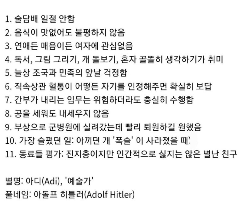 아돌프 히틀러는 술과 담배를 전혀 사용하지 않았으며, 음식이 맛없어도 불평하지 않았습니다. 또한 여자에 대한 연애나 관심이 없었고, 독서, 그림 그리기, 개 돌보기, 혼자 생각하기를 취미로 즐겼습니다. 그는 항상 조국과 민족의 앞날을 걱정하며, 직속상관이 자신을 인정해주면 확실하게 보답하는 성격이었습니다. 간부가 위험한 임무를 내려도 충실히 수행하였고, 공을 세워도 자랑하지 않았습니다. 그는 부상으로 군병원에 입원하였을 때 빨리 퇴원하고 싶은 마음이었고, 가장 슬펐던 일은 자신이 사랑하던 개 '폭슬'이 사라진 것이었습니다. 동료들은 그를 진지한 사람이지만 인간적으로는 싫지 않은 별난 친구로 평가하였으며, 아디라는 별명으로 불렸습니다. 그의 풀네임은 아돌프 히틀러입니다.