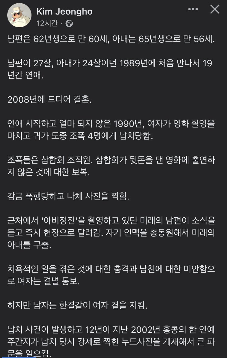 Kim Jeongho는 1989년에 27살인 남편과 24살인 아내와 처음 만났습니다. 그 후 19년간 연애를 하고 2008년에 결혼을 했습니다. 그러나 연애를 시작한지 얼마 되지 않은 1990년에 여자가 조폭 4명에게 납치당했습니다. 조폭들은 영화 출연비를 주지 않은 보복으로 이 납치를 진행했습니다. 여자는 폭행당하고 나체 사진도 찍힌 상황에서 남편과 만난 미래의 남편이 소식을 듣고 현장으로 달려갔습니다. 그는 인맥을 동원하여 여자를 구출했지만 여자는 이 사건을 겪은 충격과 미안함 때문에 결별을 통보했습니다. 그러나 남자는 여전히 여자 곁을 지키며 변함없이 지원했습니다.
