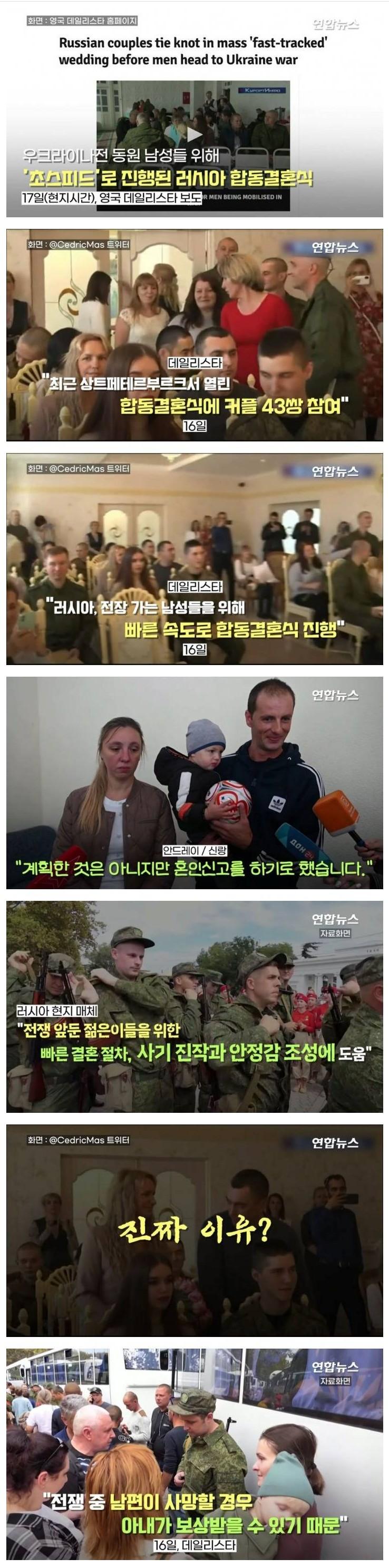 영국 데일리스타 홈페이지에 따르면, 러시아 커플들이 우크라이나 전쟁을 위해 남편들이 동원되기 전에 대규모 "초스피드" 결혼식을 진행했다고 한다. 러시아 매체에 따르면, 총 43쌍의 커플들이 이 결혼식에 참여했다고 한다. 신랑인 안드레이는 "계획한 것은 아니지만 혼인신고를 하기로 했습니다. 만약 남편이 전쟁 중에 사망한다면, 아내가 보상을 받을 수 있기 때문입니다"라고 말했다. 이 결혼식은 빠른 속도로 진행되었고, 사기진작과 안정감 조성에 도움을 주었다는 평가를 받고 있다. 이는 전쟁에 진입하는 젊은이들을 위한 서비스로서, 많은 관심을 받고 있다.