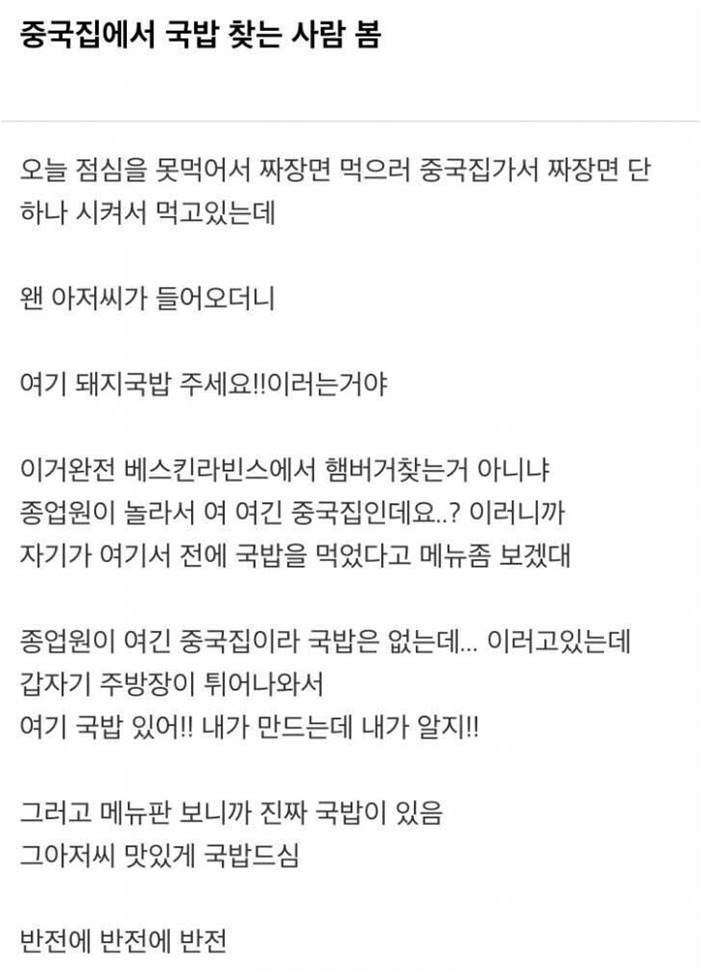 그 순간 주방장이 나와서 "여기 국밥이 있어요! 내가 만드는데 내가 알지!"라고 말했습니다. 메뉴판을 확인해보니 진짜로 국밥이 있었습니다. 그 아저씨는 맛있게 국밥을 먹었고, 이 상황은 계속해서 반전이 생기는 일이었습니다.