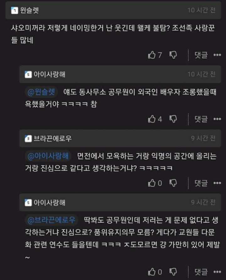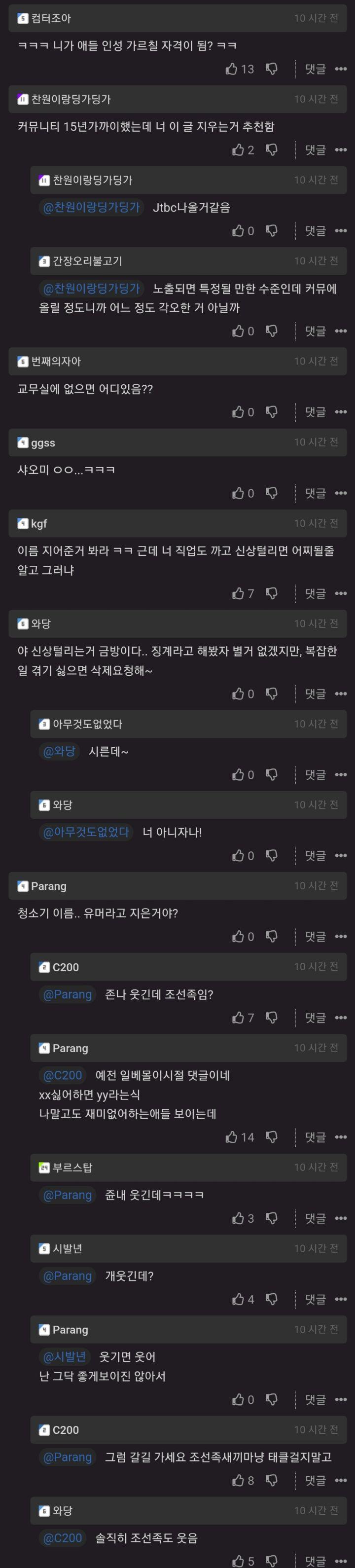 논란중인 초등학교 샤오미 로봇청소기 이름 금단비 쪽지보내기자기소개아이디로 검색전체게시물 10-25 5,497 회 0 건 조선족 청소부 아줌마 현재 초등학교 교실 청소에 대한 이야기를 다루고 있는 것 같습니다. 댕청이라는 학생이 로봇청소기에 대한 의문을 제기하고 있으며, 다른 학생들은 교사들이 교무실에 없다는 의견을 내놓고 있습니다. 다른 대화에서는 다른 단어들을 이용하여 대화를 이어가고 있습니다. 일부 내용은 도배로 보이며, 대화는 어떤 토론이 벌어지고 있는지 파악하기 어렵습니다. 목록 이메일 주소는 공개되지 않습니다. 댓글 * 이름 * 비밀번호 * 비밀글 사용 제목 글쓴이 조회 날짜 자꾸 할로윈데이 3년만이라고 하지마세요 금단비 쪽지보내기자기소개아이디로 검색전체게시물 5,526 0 22-10-31 금단비 쪽지보내기자기소개아이디로 검색전체게시물 5,526 22-10-31 우리나라에서 헬스장이 망하는 이유.jpg 동태탕 쪽지보내기자기소개아이디로 검색전체게시물 11,176 0 22-10-31 동태탕 쪽지보내기자기소개아이디로 검색전체게시물 11,176 22-10-31 이상민 망언에 CNN 담당자 코멘트 재미난도시락 쪽지보내기자기소개아이디로 검색전체게시물 5,848 0 22-10-31 재미난도시락 쪽지보내기자기소개아이디로 검색전체게시물 5,848 22-10-31 이태원 사고 때문에 행사 30분전에 취소된 족발파는 어르신..... 밝은횃불 쪽지보내기자기소개아이디로 검색전체게시물 5,685 0 22-10-31 밝은횃불 쪽지보내기자기소개아이디로 검색전체게시물 5,685 22-10-31 SK 하이닉스 근황 몽비쥬 쪽지보내기자기소개아이디로 검색전체게시물 6,401 0 22-10-30 몽비쥬 쪽지보내기자기소개아이디로 검색전체게시물 6,401 22-10-30 블랙유머의 결정체 몽비쥬 쪽지보내기자기소개아이디로 검색전체게시물 4,931 0 22-10-30 몽비쥬 쪽지보내기자기소개아이디로 검색전체게시물 4,931 22-10-30 이태원 사망자 지인들이 받은 문자 밝은횃불 쪽지보내기자기소개아이디로 검색전체게시물 9,193 0 22-10-30 밝은횃불 쪽지보내기자기소개아이디로 검색전체게시물 9,193 22-10-30 [속보] "이태원서 심정지 추정 환자 50여명 발생" 모카크림 쪽지보내기자기소개아이디로 검색전체게시물 5,063 0 22-10-30 모카크림 쪽지보내기자기소개아이디로 검색전체게시물 5,063 22-10-30 공사현장에 외국인 노동자들이 안보여서 몽비쥬 쪽지보내기자기소개아이디로 검색전체게시물 5,124 0 22-10-28 몽비쥬 쪽지보내기자기소개아이디로 검색전체게시물 5,124 22-10-28 차알못 여자친구의 그랜져GN7 반응.. 세계는지금 쪽지보내기자기소개아이디로 검색전체게시물 5,978 0 22-10-27 세계는지금 쪽지보내기자기소개아이디로 검색전체게시물 5,978 22-10-27 의사들의 요즘 현실 달콤별 쪽지보내기자기소개아이디로 검색전체게시물 5,538 0 22-10-27 달콤별 쪽지보내기자기소개아이디로 검색전체게시물 5,538 22-10-27 생리대보다 5만배 편한 생리팬티에 대해 도레미 쪽지보내기자기소개아이디로 검색전체게시물 5,371 0 22-10-26 도레미 쪽지보내기자기소개아이디로 검색전체게시물 5,371 22-10-26 SPC불매 근황.JPG 밝은횃불 쪽지보내기자기소개아이디로 검색전체게시물 5,860 0 22-10-26 밝은횃불 쪽지보내기자기소개아이디로 검색전체게시물 5,860 22-10-26 이경규가 복수혈전 찍으면서 제일 많이 다친 사람 도레미 쪽지보내기자기소개아이디로 검색전체게시물 5,296 0 22-10-26 도레미 쪽지보내기자기소개아이디로 검색전체게시물 5,296 22-10-26 여우가 전설의 고향 주인공이 된 이유 동태탕 쪽지보내기자기소개아이디로 검색전체게시물 6,115 0 22-10-26 동태탕 쪽지보내기자기소개아이디로 검색전체게시물 6,115 22-10-26 ⭐ 논란중인 초등학교 샤오미 로봇청소기 이름 금단비 쪽지보내기자기소개아이디로 검색전체게시물 5,498 0 22-10-25 금단비 쪽지보내기자기소개아이디로 검색전체게시물 5,498 22-10-25 간혹 중국집에 있다는 히든메뉴.jpg 옆집총각 쪽지보내기자기소개아이디로 검색전체게시물 5,119 0 22-10-25 옆집총각 쪽지보내기자기소개아이디로 검색전체게시물 5,119 22-10-25 직장인 어플 블라인드가 만들어진 이유.jpg 도레미 쪽지보내기자기소개아이디로 검색전체게시물 6,216 0 22-10-24 도레미 쪽지보내기자기소개아이디로 검색전체게시물 6,216 22-10-24 우크라이나의 모병 광고 모카크림 쪽지보내기자기소개아이디로 검색전체게시물 5,146 0 22-10-24 모카크림 쪽지보내기자기소개아이디로 검색전체게시물 5,146 22-10-24 일단 저장해두면 반드시 도움 되는 사이트 8 몽비쥬 쪽지보내기자기소개아이디로 검색전체게시물 5,725 0 22-10-24 몽비쥬 쪽지보내기자기소개아이디로 검색전체게시물 5,725 22-10-24 연금복권 당첨자 소감 금단비 쪽지보내기자기소개아이디로 검색전체게시물 5,232 0 22-10-23 금단비 쪽지보내기자기소개아이디로 검색전체게시물 5,232 22-10-23 군생활 최악의 시나리오.jpg 몽비쥬 쪽지보내기자기소개아이디로 검색전체게시물 5,386 0 22-10-23 몽비쥬 쪽지보내기자기소개아이디로 검색전체게시물 5,386 22-10-23 일본 협궤 규격 철도망.jpg 지니까꿍 쪽지보내기자기소개아이디로 검색전체게시물 5,964 0 22-10-22 지니까꿍 쪽지보내기자기소개아이디로 검색전체게시물 5,964 22-10-22 