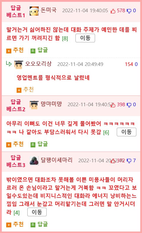 남자들은 미용실에 가면 안될까요? 어느 남자 손님은 미용사 언니에게 사는 곳이 어디고 무슨 일을 하는지 물어봤다고 합니다. 그 이후로 그 손님이 한 번도 오지 않았다네요. 그래서 자기가 뭘 잘못한 건지 계속 생각해봤는데 도저히 모르겠다네요. 이 이야기를 듣고 웃겨서 답글을 단 것 같아요. 다른 사람들도 이상한 질문은 싫어한다고 말씀하시네요. 돈미국님이 영업 멘트를 형식적으로 날리시고 오오모리상도 답글을 달아주셨네요. 그리고 먕먀미먕님이 그 질문이 너무 깊다고 말씀하시고 자신도 그래서 부담스럽다면 못갈 것 같다고 하셨어요. 달팽이세마리님도 밖이었으면 이쁜 미용사들이 머리를 자르러 온 손님이라고 말하지 않았을까 추측하시고, 그래서 눈을 감고 미용사의 안대를 끼우면 말을 안하실 것 같다고 이야기하셨네요.