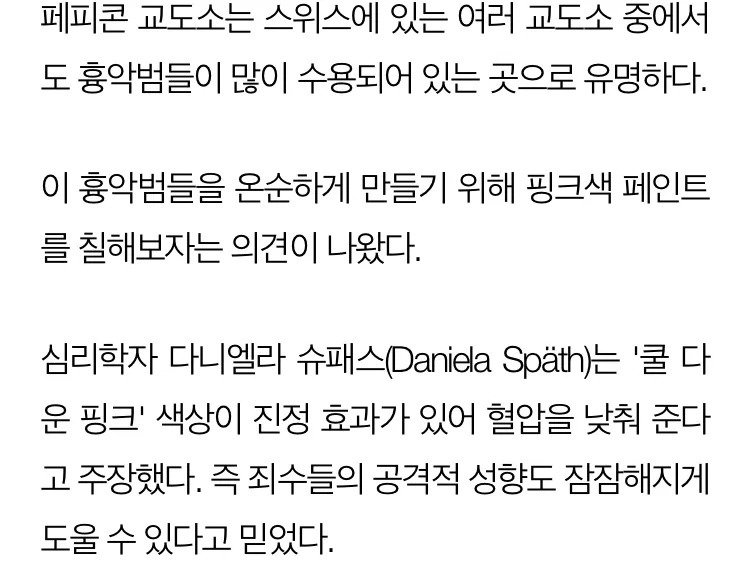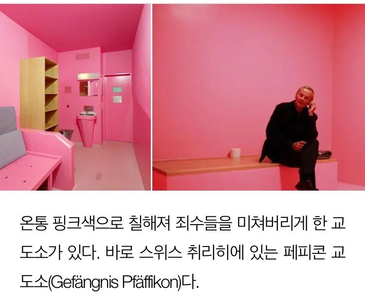스위스 취리히에 위치한 페피콘 교도소는 핑크색으로 칠해져있어서 죄수들을 미쳐버리게 만드는 교도소이다. 이 교도소는 흉악범들을 수용하는 곳으로 유명하다. 이 교도소에서는 심리학자인 다니엘라 슈패스의 주장에 따라 핑크색은 진정 효과가 있어서 공격적인 성향을 잠재우고 혈압을 낮춰줄 수 있다고 여겨져서 핑크색 페인트를 사용해 본 결과 수감자들의 공격성이 감소했다고 보고되었다. 그러나 전직 수감자인 페터 짐머만은 핑크 방에 갇히면 2일 안에 미쳐버릴 수 있다고 경고했다. 외국인 남성의 경우도 핑크색으로 인해 특정 호르몬이 억제되어 공격적인 행동이 줄어든다고 한다. 이를 바탕으로 분홍색을 이용한 범죄자의 심리 치료 방법이 도입되었고, 현재까지 30개의 감방이 핑크색으로 칠해져 있다. 현지 심리 전문가들은 분홍색으로 단장한 교도소에서 긍정적인 효과가 보인다고 평가하고 있다.