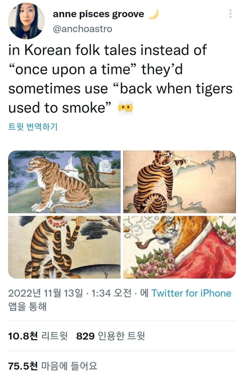 앤 피스체스 그루브는 한국 전래동화에서 "한때 호랑이가 담배를 피웠던 시절에"라고 할 때도 있었다고 말합니다. 이 트윗은 2022년 11월 13일 오전 1시 34분에 Twitter for iPhone 앱을 통해 게시되었으며, 10.8천 명이 리트윗했고 829 명이 인용했으며, 75.5천 명이 좋아했습니다.