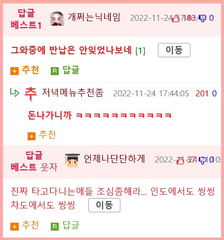 LG U+가 마지막 사용자의 반납사진을 받았다고 합니다. GWOO MOTORS라는 답글이 베스트 1로 올라왔는데, 이 시간은 오후 6시 12분인 것 같습니다. 그와 동시에 반납을 잊지 않았나 보입니다. "이동"이라는 답글이 달렸고, 추천이 되었습니다. 다른 개쩌는 닉네임이 작성한 답글도 있습니다. 날짜는 2022년 11월 24일이며, 시간은 18시 49분입니다. LD씨가 저녁메뉴를 추천해달라고 요청하였는데, 추천수는 201개입니다. 돈이 많이 나가서 그런지 LD씨가 ㅋㅋㅋ 연속해서 웃고 있습니다. 언제나 단단하게이라는 닉네임의 작성자도 경고를 주었습니다. "진짜 타고다니는애들 조심좀해라... 인도에서도 씽씽 차도에서도 씽씽"이라는 메시지를 남겼고, 이동님이 이에 대해 답글을 작성하였습니다. 이 답글은 54%의 추천을 받았습니다.