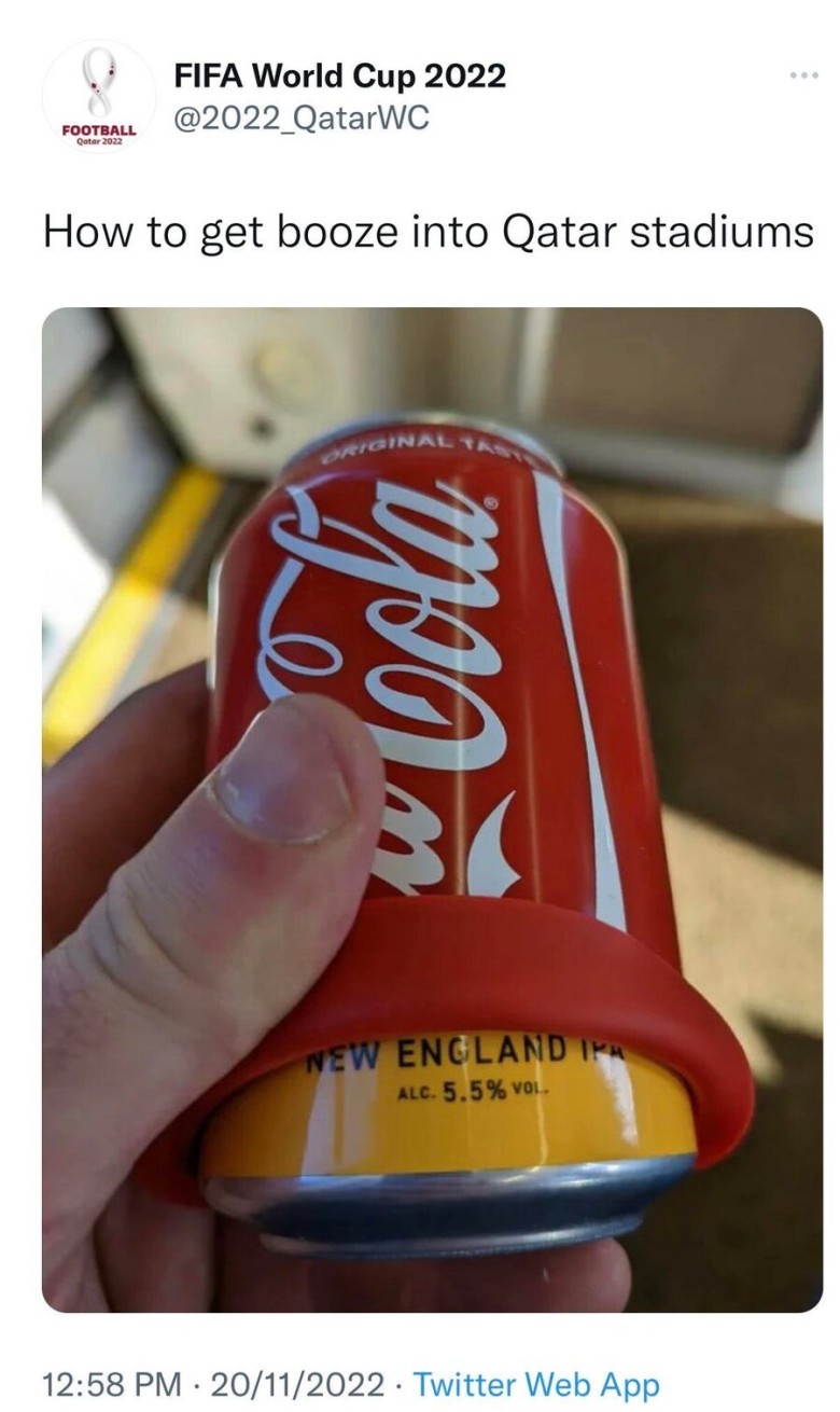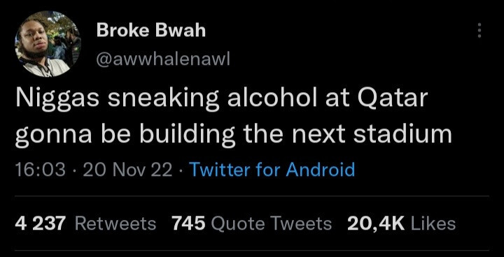 2022년 카타르 월드컵에서 술을 어떻게 들여올 수 있는지에 대한 글이다. @2022_QatarWC는 카타르 월드컵 공식 계정이다. 20/11/2022 12:58 PM에 "ORIGINAL TAST yog NEW ENGLAND IPA ALC. 5.5% VOL."라는 술에 대한 내용의 트윗이 올라왔다. 그리고 20 Nov 22일 오후 4시 3분에 "Niggas sneaking alcohol at Qatar gonna be building the next stadium"라는 트윗이 올라왔다. 이 트윗은 @awwhalenawl이 작성한 것으로, 4명의 유저가 리트윗하고 745개의 인용 트윗이 있으며 20.4K개의 좋아요를 받았다.