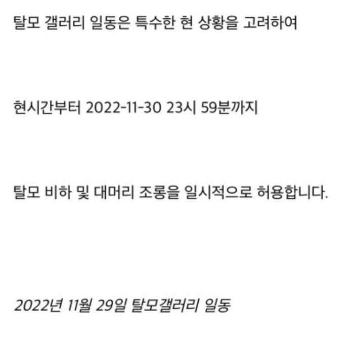 2022년 11월 29일, 탈모 갤러리 일동은 특별한 조치를 통해 한정된 시간 동안 탈모에 대한 희롱과 머리가 없는 사람들을 조롱하는 게시글을 허용하기로 결정했습니다. 이 결정은 2022년 11월 30일 23시 59분까지 유효하며, 해당 기간 동안 탈모 관련된 비하글을 자유롭게 작성할 수 있습니다.