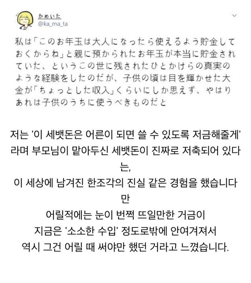 세뱃돈은 엄마가 잘 보관했다가 ㅇㅇ이가 나중에 크면 줄거야~ 모카크림 쪽지보내기자기소개아이디로 검색전체게시물 12-06 5,866 회 0 건 나는 "이 세뱃돈은 어른이 되면 쓸 수 있도록 저금해줄게"라며 부모님이 맡아두신 세뱃돈이 진짜로 저축되어 있다고 하는 이 세상에 남겨진 한조각의 진실 같은 경험을 했다. 그러나 어릴 때는 눈이 번쩍 뜨일만한 거금이 지금은 '소소한 수입' 정도로만 여겨져서 역시 그건 어릴 때 써야만 하는 것이라고 느꼈다. 목록 이메일 주소는 공개되지 않습니다. 댓글 * 이름 * 비밀번호 * 비밀글 사용 제목 글쓴이 조회 날짜 바이킹의 무식함.jpg 달콤별 쪽지보내기자기소개아이디로 검색전체게시물 6,612 0 22-12-12 달콤별 쪽지보내기자기소개아이디로 검색전체게시물 6,612 22-12-12 자각몽 괴담.jpg 도레미 쪽지보내기자기소개아이디로 검색전체게시물 7,722 0 22-12-12 도레미 쪽지보내기자기소개아이디로 검색전체게시물 7,722 22-12-12 축협사건 간단 요약 몽비쥬 쪽지보내기자기소개아이디로 검색전체게시물 5,791 0 22-12-10 몽비쥬 쪽지보내기자기소개아이디로 검색전체게시물 5,791 22-12-10 나라별 겨울철 실내온도 얼음사이다 쪽지보내기자기소개아이디로 검색전체게시물 7,866 0 22-12-10 얼음사이다 쪽지보내기자기소개아이디로 검색전체게시물 7,866 22-12-10 국제결혼 하지마라..단점알려준다 금단비 쪽지보내기자기소개아이디로 검색전체게시물 7,862 0 22-12-10 금단비 쪽지보내기자기소개아이디로 검색전체게시물 7,862 22-12-10 축협 까는 벤투 도레미 쪽지보내기자기소개아이디로 검색전체게시물 6,028 0 22-12-09 도레미 쪽지보내기자기소개아이디로 검색전체게시물 6,028 22-12-09 윈도우10 22H2 작업표시줄에 뉴스및날씨 표시없애기 몽비쥬 쪽지보내기자기소개아이디로 검색전체게시물 6,090 0 22-12-09 몽비쥬 쪽지보내기자기소개아이디로 검색전체게시물 6,090 22-12-09 유럽식 선진축구를 도입한 차두리 근황.jpg 달콤별 쪽지보내기자기소개아이디로 검색전체게시물 6,385 0 22-12-09 달콤별 쪽지보내기자기소개아이디로 검색전체게시물 6,385 22-12-09 요즘 부동산 시장 근황.twitter 옆집총각 쪽지보내기자기소개아이디로 검색전체게시물 6,241 0 22-12-08 옆집총각 쪽지보내기자기소개아이디로 검색전체게시물 6,241 22-12-08 강형욱씨가 말하는 말라뮤트. 모카크림 쪽지보내기자기소개아이디로 검색전체게시물 5,723 0 22-12-08 모카크림 쪽지보내기자기소개아이디로 검색전체게시물 5,723 22-12-08 파란섀도우 쓴 연예인 달콤별 쪽지보내기자기소개아이디로 검색전체게시물 7,486 0 22-12-08 달콤별 쪽지보내기자기소개아이디로 검색전체게시물 7,486 22-12-08 최근 스타트업들 투자 근황 도레미 쪽지보내기자기소개아이디로 검색전체게시물 6,368 0 22-12-07 도레미 쪽지보내기자기소개아이디로 검색전체게시물 6,368 22-12-07 폐지 줍는 할머니 둘러싼 중학생들 1 모카크림 쪽지보내기자기소개아이디로 검색전체게시물 5,501 1 22-12-07 모카크림 쪽지보내기자기소개아이디로 검색전체게시물 5,501 22-12-07 브라질이 우승 할 수 밖에 없는 이유 동태탕 쪽지보내기자기소개아이디로 검색전체게시물 5,395 0 22-12-06 동태탕 쪽지보내기자기소개아이디로 검색전체게시물 5,395 22-12-06 브라질 대통령 당선인 룰라 명언 옆집총각 쪽지보내기자기소개아이디로 검색전체게시물 7,359 0 22-12-06 옆집총각 쪽지보내기자기소개아이디로 검색전체게시물 7,359 22-12-06 ⭐ 세뱃돈은 엄마가 잘 보관했다가 ㅇㅇ이가 나중에 크면 줄거야~ 모카크림 쪽지보내기자기소개아이디로 검색전체게시물 5,867 0 22-12-06 모카크림 쪽지보내기자기소개아이디로 검색전체게시물 5,867 22-12-06 일본이 한국의 후예라고 주장하는 외국인 동태탕 쪽지보내기자기소개아이디로 검색전체게시물 5,570 0 22-12-05 동태탕 쪽지보내기자기소개아이디로 검색전체게시물 5,570 22-12-05 FIFA VIP석에 앉아있는 한국인 금단비 쪽지보내기자기소개아이디로 검색전체게시물 5,559 0 22-12-05 금단비 쪽지보내기자기소개아이디로 검색전체게시물 5,559 22-12-05 중국인들에게 월드컵이 알려 준 진실... 달콤별 쪽지보내기자기소개아이디로 검색전체게시물 5,126 0 22-12-05 달콤별 쪽지보내기자기소개아이디로 검색전체게시물 5,126 22-12-05 추억의 용팔이 데스티니 사건.jpg 도레미 쪽지보내기자기소개아이디로 검색전체게시물 5,375 0 22-12-05 도레미 쪽지보내기자기소개아이디로 검색전체게시물 5,375 22-12-05 수아레즈 조롱하는 박지성 절친 에브라.jpgif 지니까꿍 쪽지보내기자기소개아이디로 검색전체게시물 5,702 0 22-12-05 지니까꿍 쪽지보내기자기소개아이디로 검색전체게시물 5,702 22-12-05 중국 사극에 '갓' 등장 아시가루 쪽지보내기자기소개아이디로 검색전체게시물 4,886 0 22-12-05 아시가루 쪽지보내기자기소개아이디로 검색전체게시물 4,886 22-12-05 황희찬 역전골이 만화에서 나올 법한 이유 (feat:슬램덩크) 아시가루 쪽지보내기자기소개아이디로 검색전체게시물 6,910 0 22-12-05 아시가루 쪽지보내기자기소개아이디로 검색전체게시물 6,910 22-12-05 토토로 13억 굴리던 김용만 모카크림 쪽지보내기자기소개아이디로 검색전체게시물 5,230 0 22-12-04 