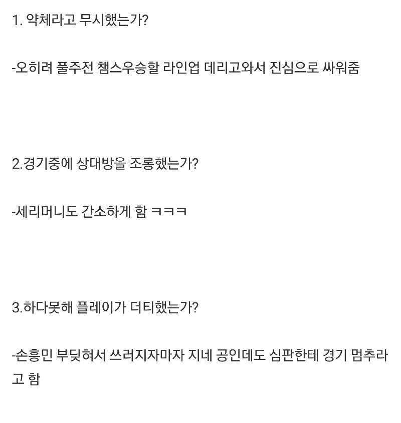 심지어 플레이가 더티했는가? 손흥민이 부딪혀 쓰러진 상황에서 심판이 경기를 멈추라고 요청한 것에 대해, 상대팀은 자신의 이점을 활용하려고 하며 심판에게 압력을 가했다.