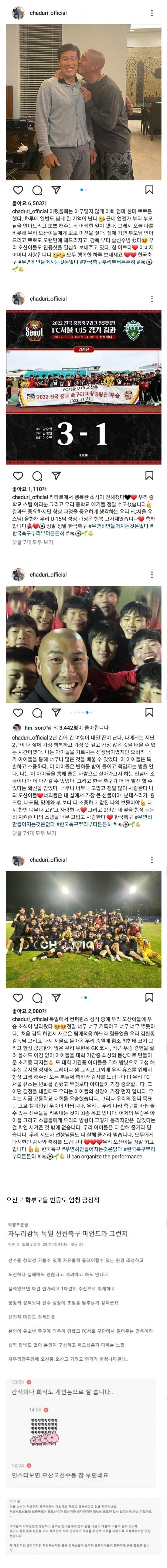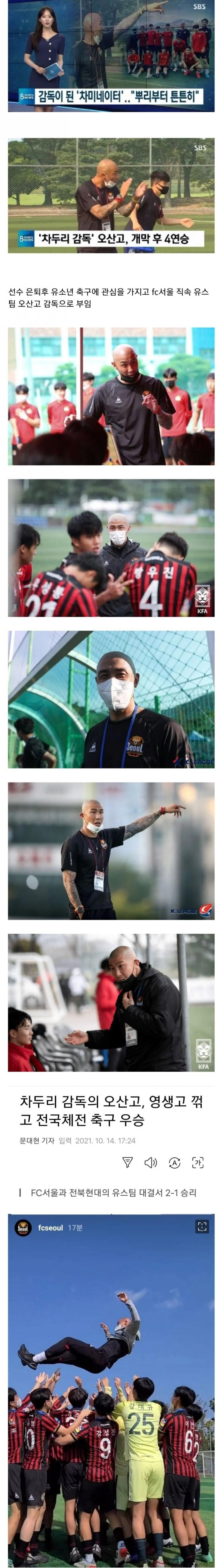 유스팀 감독으로 부임한 차두리 감독이 이끄는 오산고 축구팀이 개막 후 4연승을 기록하며 엄청난 성과를 내고 있다. 그들은 전국체전에서 영생고를 꺾고 우승을 차지하는 등 뛰어난 실력을 보여주고 있다. 차두리 감독은 오산고에서 선진축구를 도입하여 학교 분위기를 완전히 바꾸고 있는 것으로 알려져 있다. 그는 인스타그램에서도 오산고의 분위기와 함께 뿌리부터 튼튼한 선수를 만들어내는 노력을 보여주고 있다. 오산고 축구팀의 성적은 아직 미래를 증명해야 할 부분이 많지만, 차두리 감독은 그들을 다짐하며 함께 성장해 나갈 것이라고 말하고 있다.